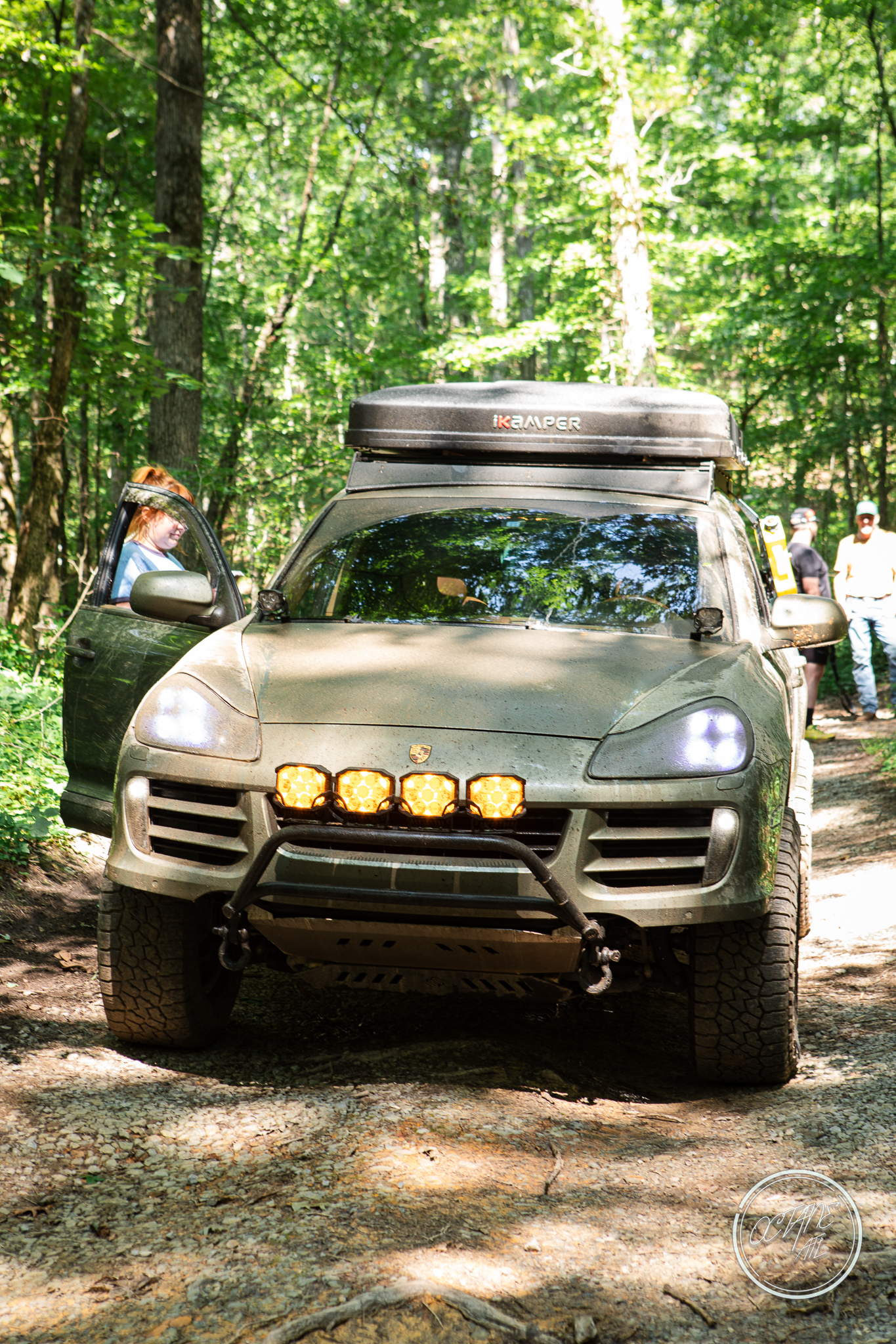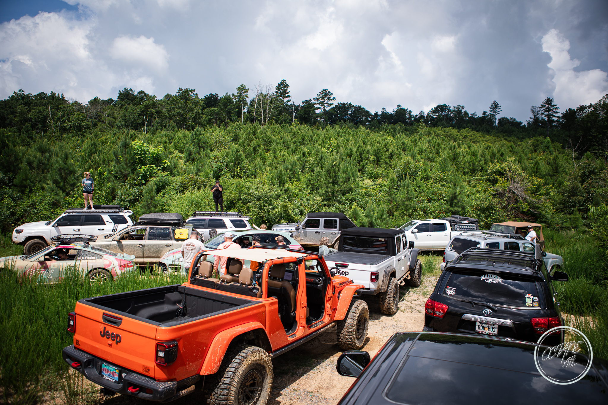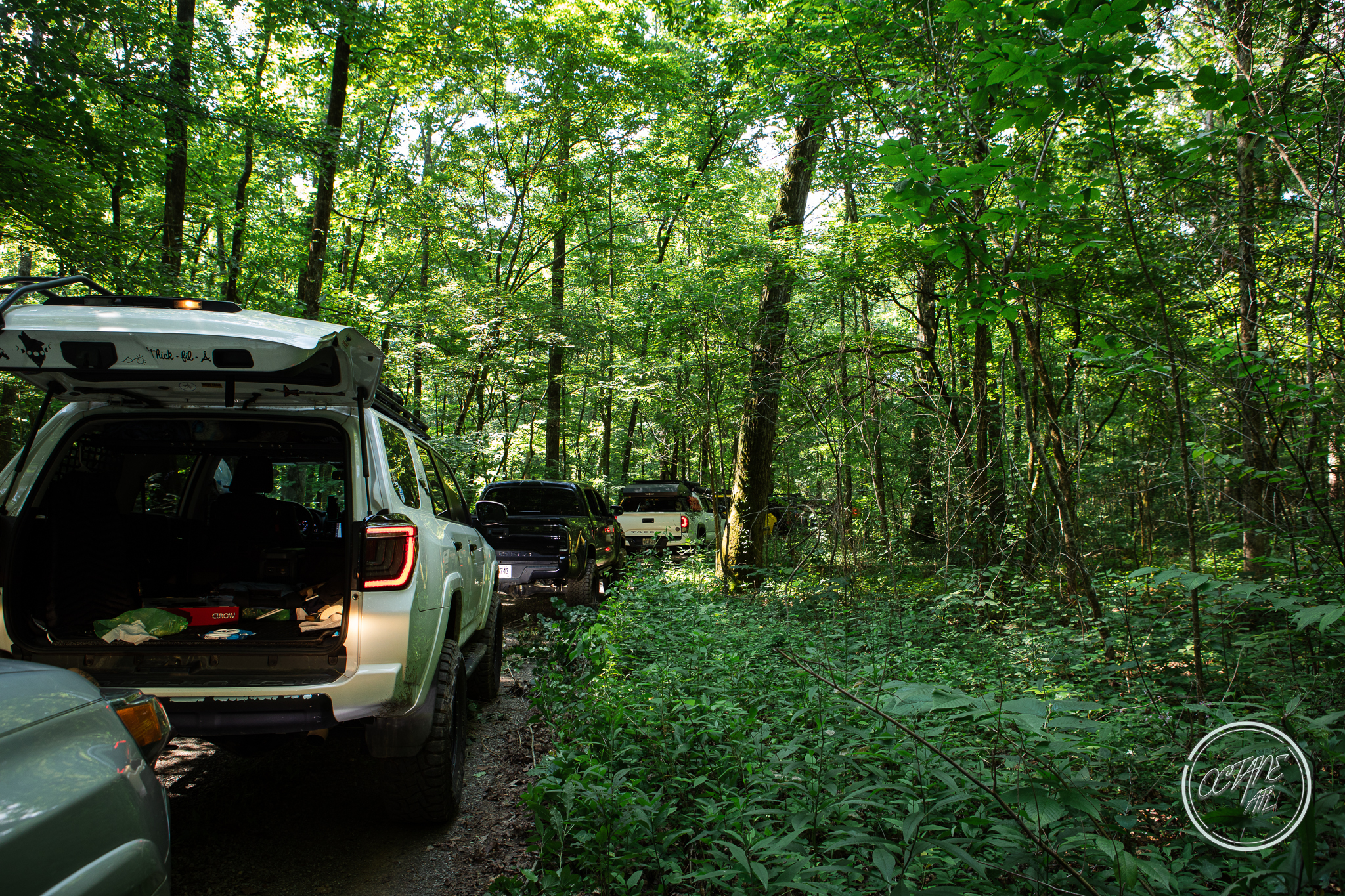 One of the drivers didn’t quite nail the line through a particularly deep and misleading mud pit so some folks got to break out the recovery gear and we helped to ensure the depth in multiple spots of the area, then it was back to the drive up to the clearing. It was a scorcher once the sun heated up the forest and the air was dense with the threat of a summer shower looking in the distance. As we proceeded up towards the end of the path the vegetation shifted from lush forest to shorter brush and tall grasses, giving way to peeps of the surrounding foothills before the road dead ends at a horseshoe.