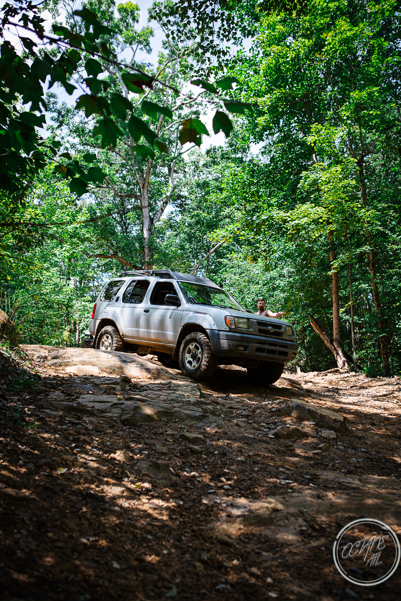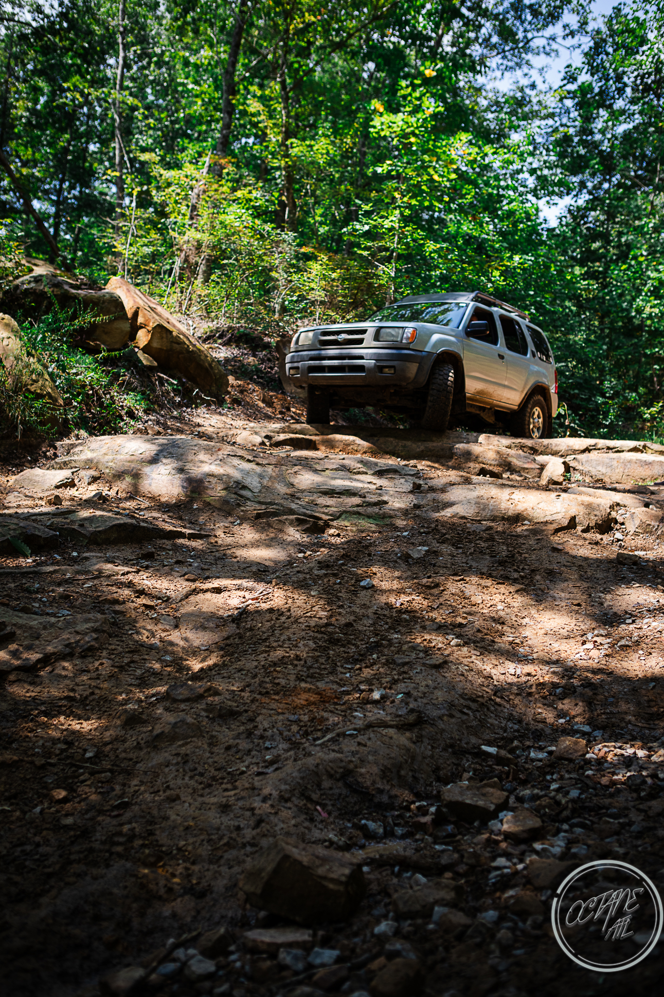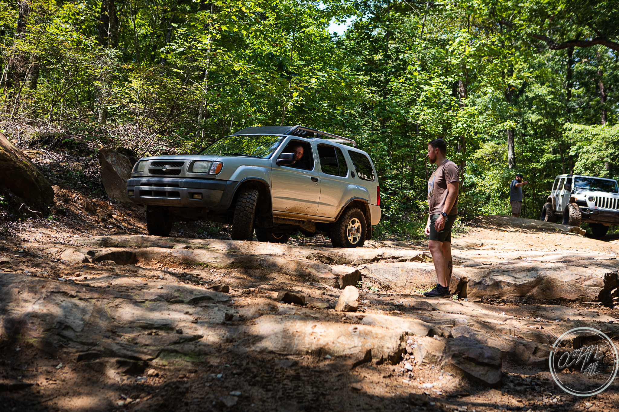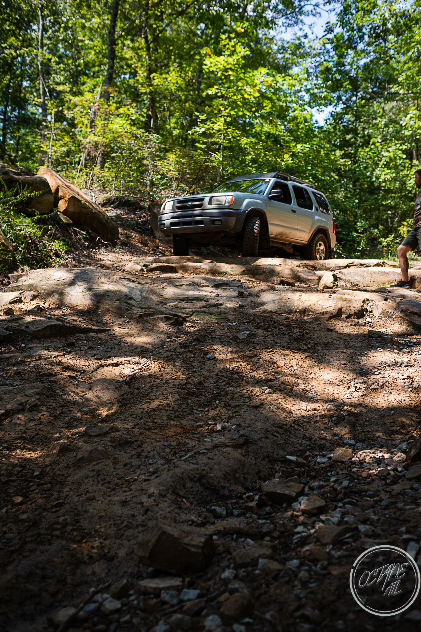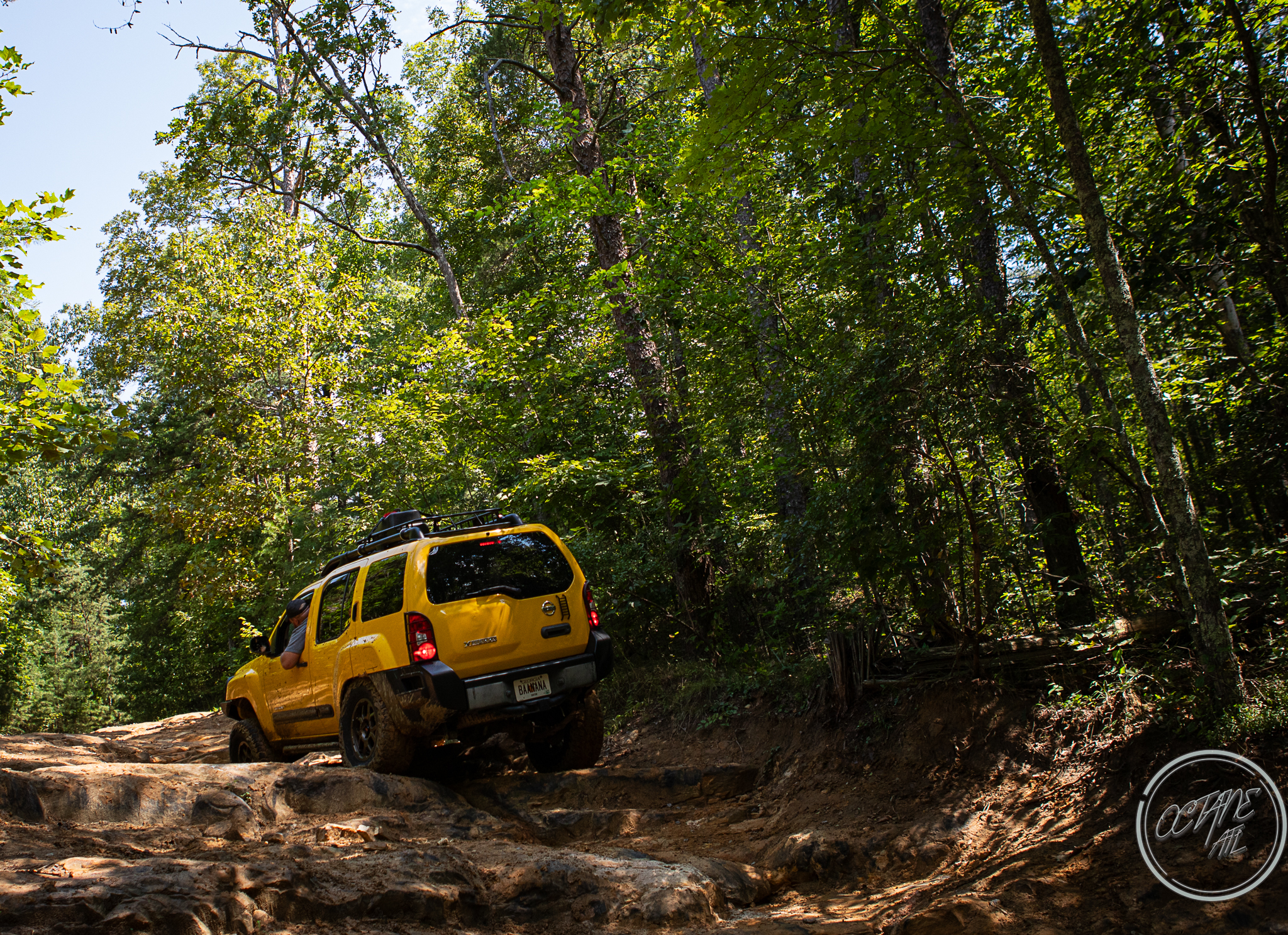 From there we headed north crossing the state line and heading just outside of Chattanooga. We started off heading to a road that, at the entrance, looks like a residential road that would be pretty simple, but the friends who had done the trail quickly reminded us they recommended airing down, which we all did and were almost immediately grateful for. The road leads in with some simple dips and small rocks to journey over but soon leads to some more technical paths. There are options to bypass the harder spaces, and a few of our group opted to bypass the more rocky, challenging spot at the beginning of the road while others gave it their best shot, navigating large climbs and drops, especially for my nearly-stock first gen Xterra.