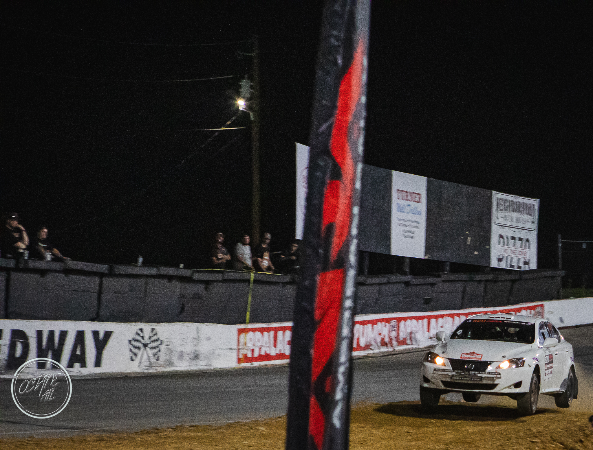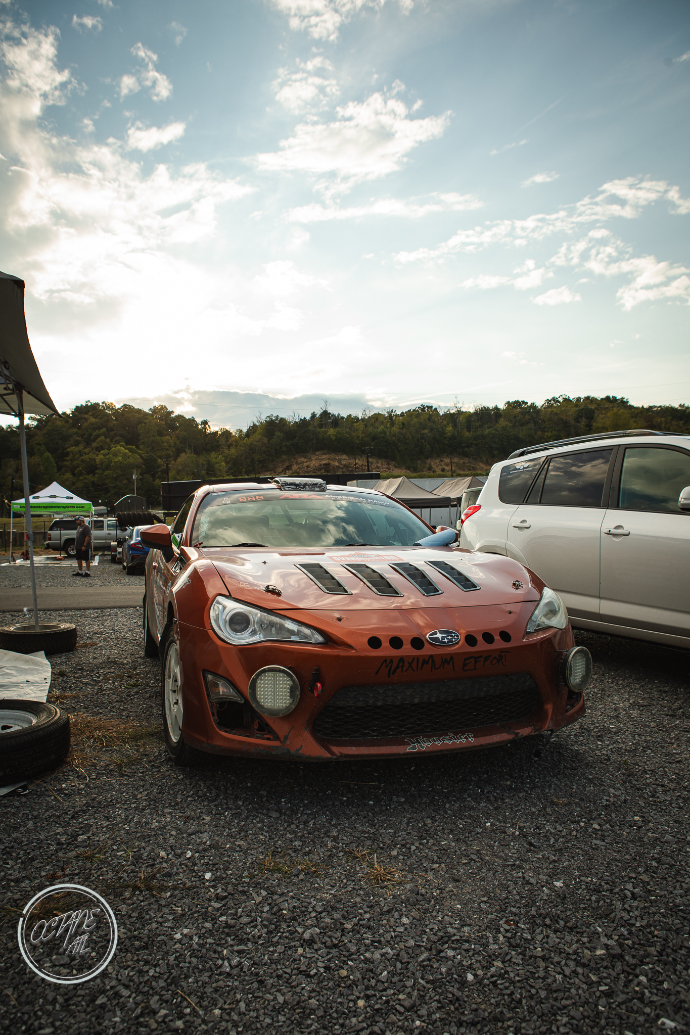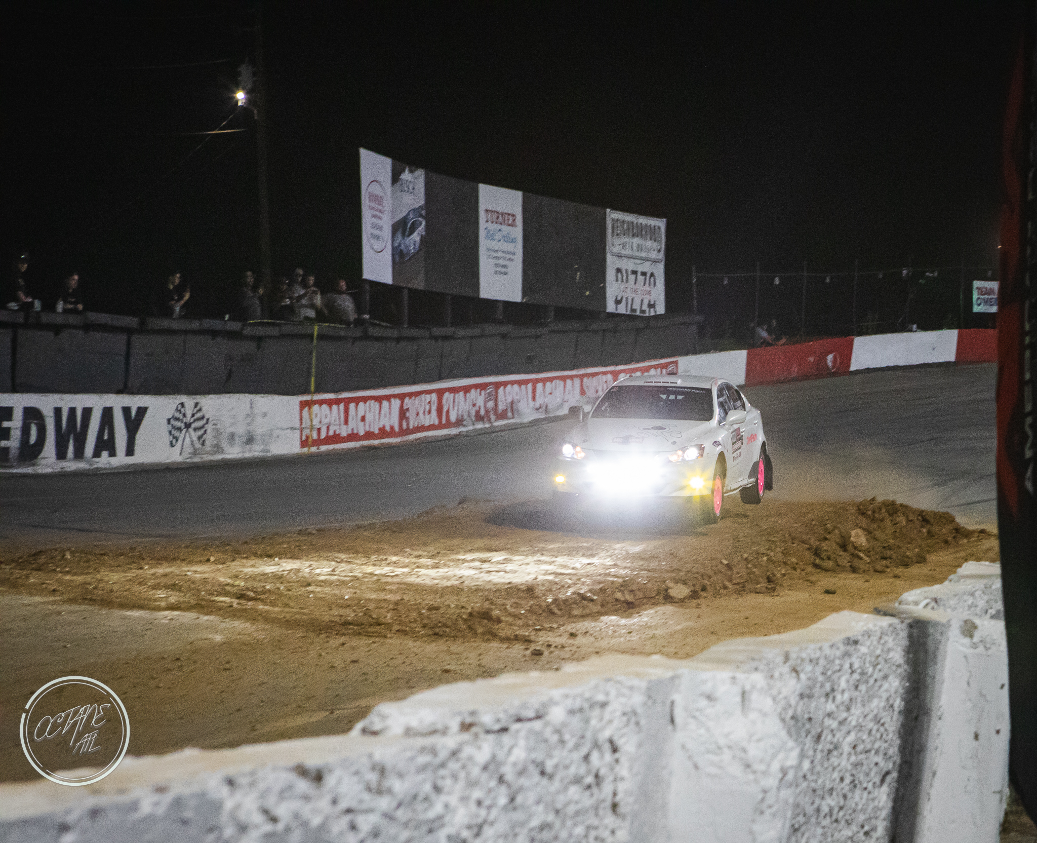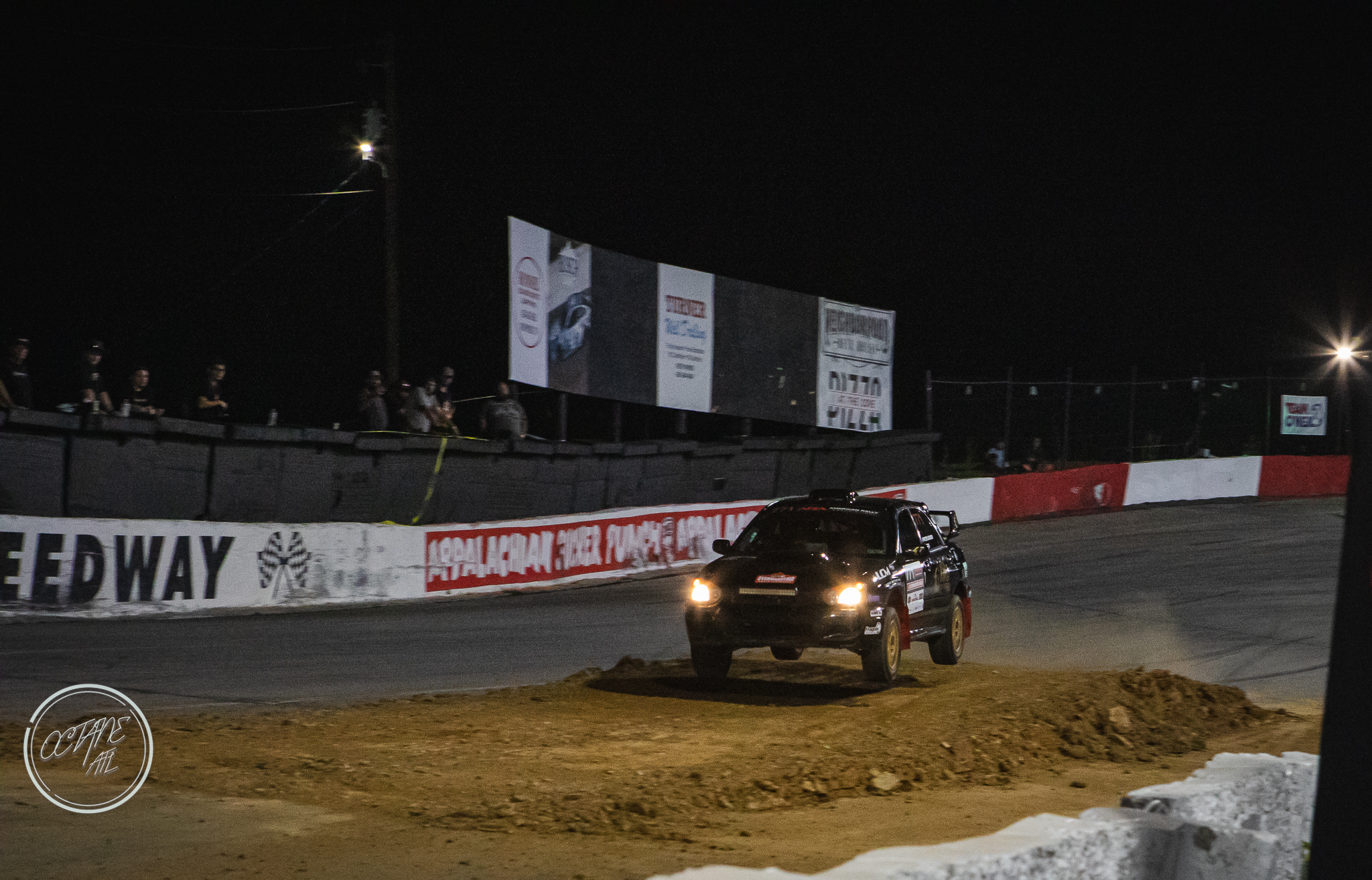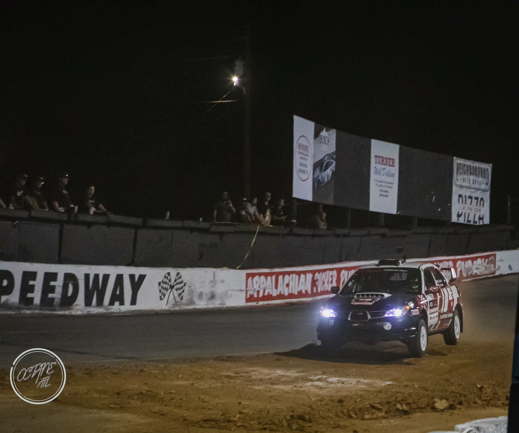 Saturday we chose a captive stage where the course shifted from gravel to pavement, which according to some of the drivers, was a bit slippery from a build up of moss. The first pass of our stage was shortened due to an off course just up the stage from us- one of the teams had missed the turn and wound up down the mountain side in the river, so we had a total of 8 cars make it through the first run. The second run there was a fuller roster, though notably more than just one car was missing. It was noted by most teams that this was one of the most technical rallies of the season, and the hills of Tennessee were proving to be harsh and challenging. By the time the third pass for our stage began the light was fading and the number of cars that passed had dwindled from a start of 50 down to a total of 36 that had made it to the last off road stage of the night. From there the teams headed back to Newport Speedway for the final event, a jump and barrels, which we missed due to helping clear our stage of spectators and cleaning up any trash as well as the tape used to mark off spectator areas.