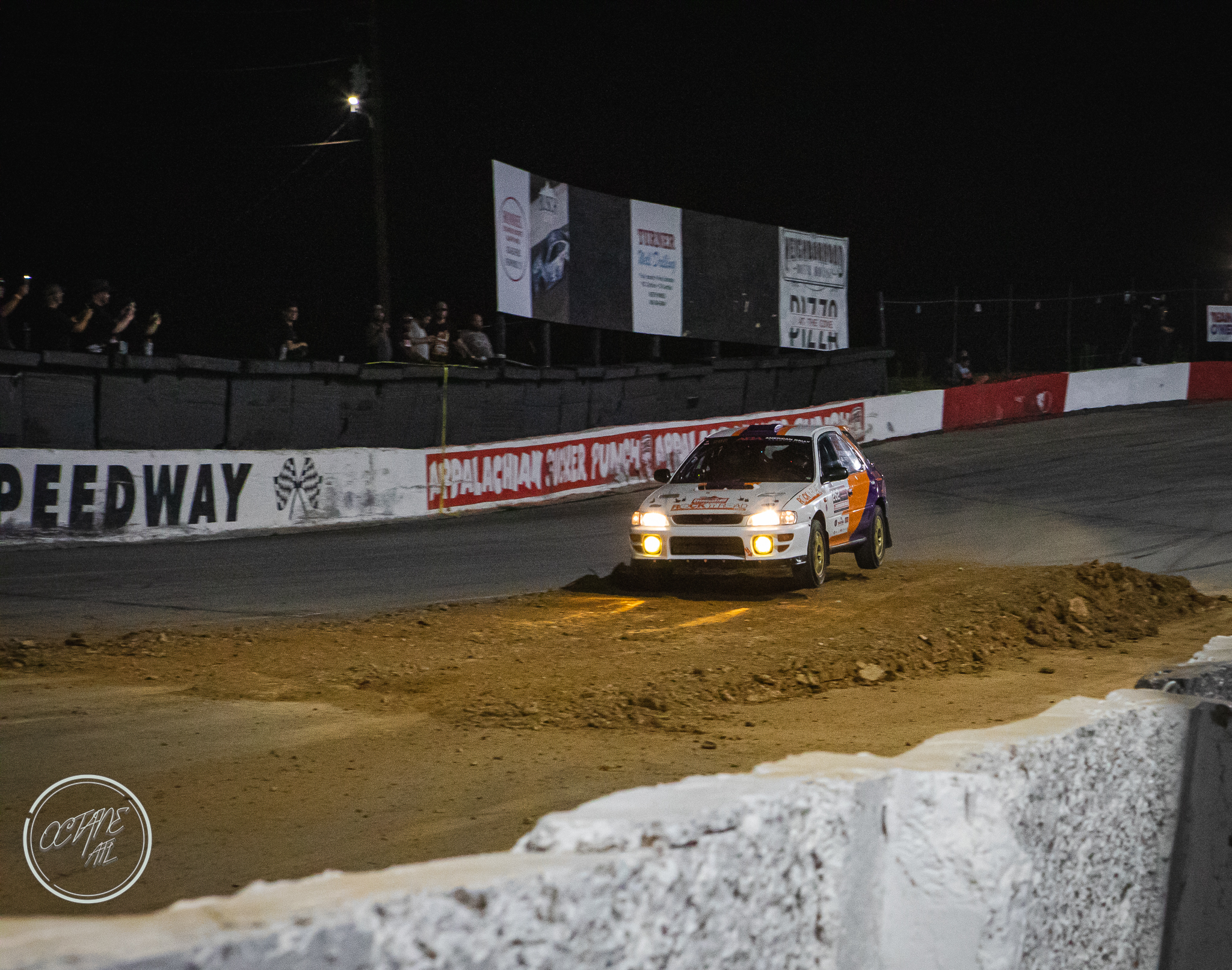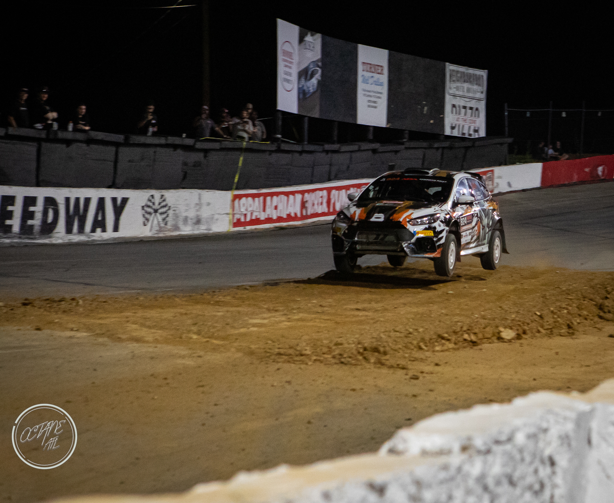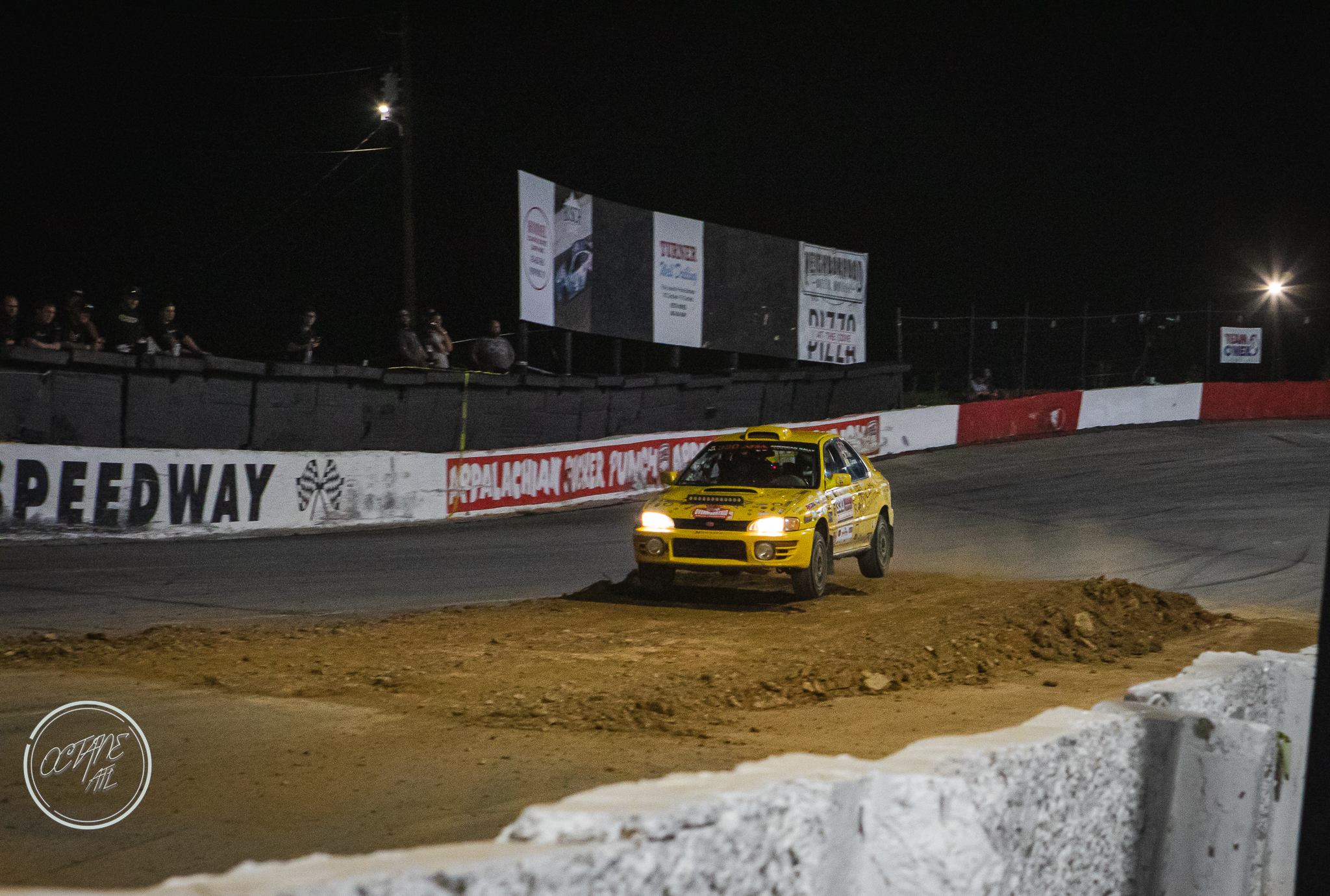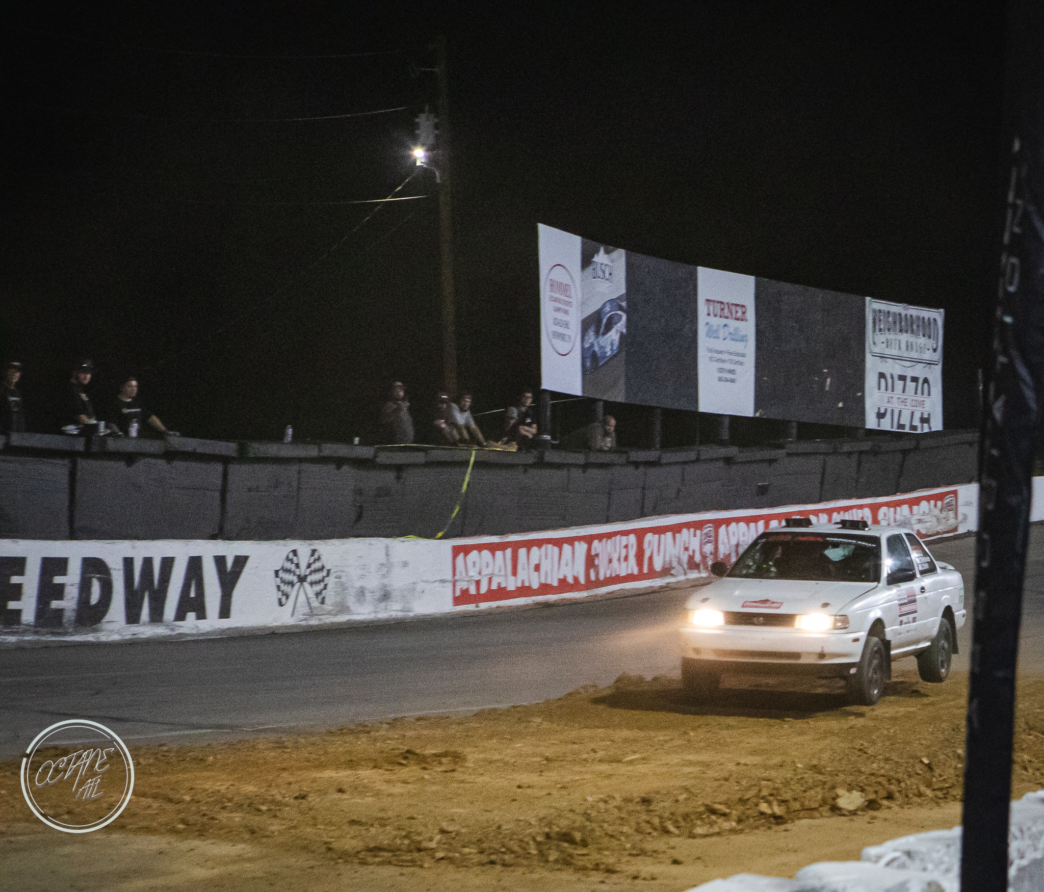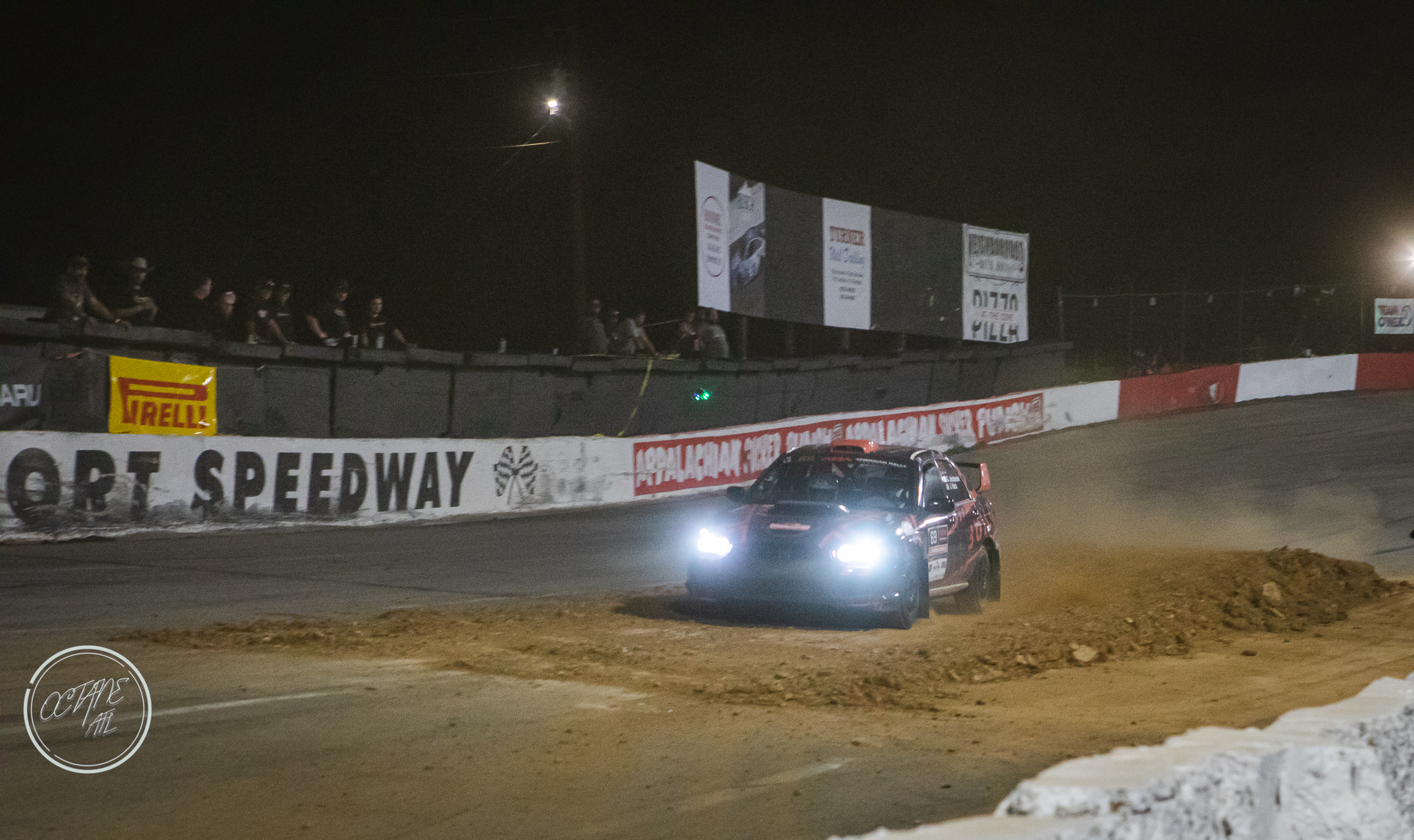 Saturday we chose a captive stage where the course shifted from gravel to pavement, which according to some of the drivers, was a bit slippery from a build up of moss. The first pass of our stage was shortened due to an off course just up the stage from us- one of the teams had missed the turn and wound up down the mountain side in the river, so we had a total of 8 cars make it through the first run. The second run there was a fuller roster, though notably more than just one car was missing. It was noted by most teams that this was one of the most technical rallies of the season, and the hills of Tennessee were proving to be harsh and challenging. By the time the third pass for our stage began the light was fading and the number of cars that passed had dwindled from a start of 50 down to a total of 36 that had made it to the last off road stage of the night. From there the teams headed back to Newport Speedway for the final event, a jump and barrels, which we missed due to helping clear our stage of spectators and cleaning up any trash as well as the tape used to mark off spectator areas.