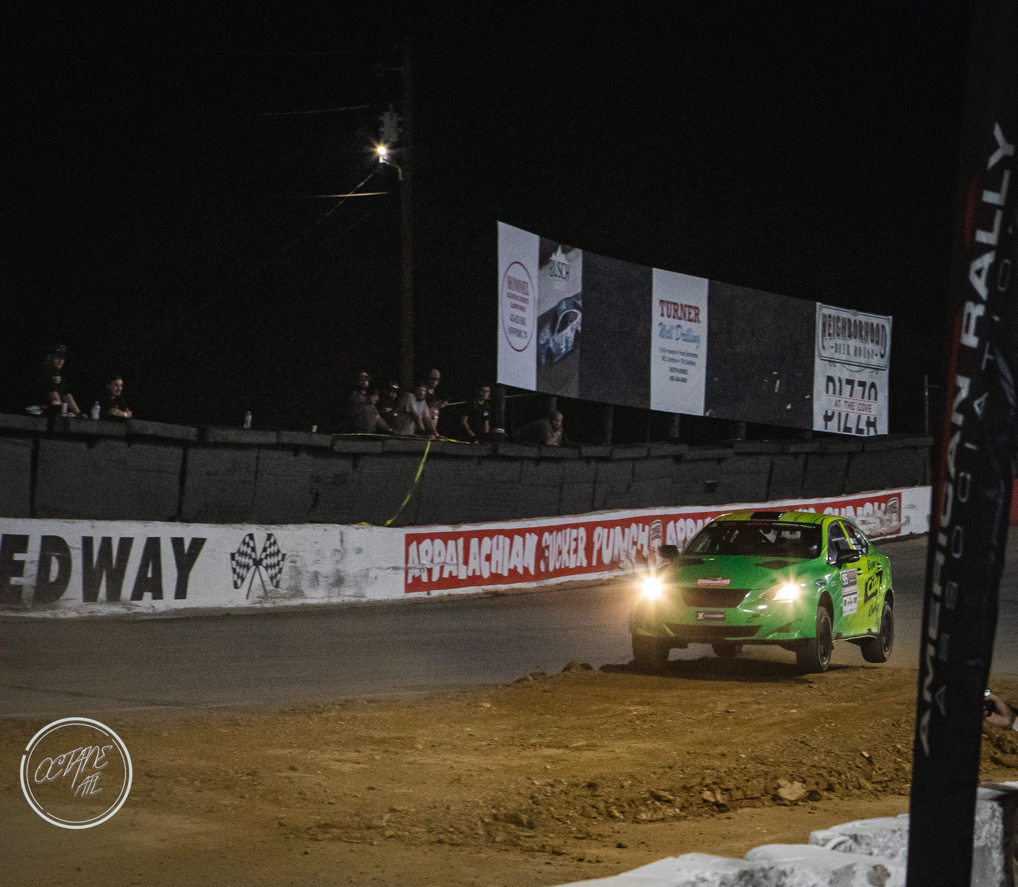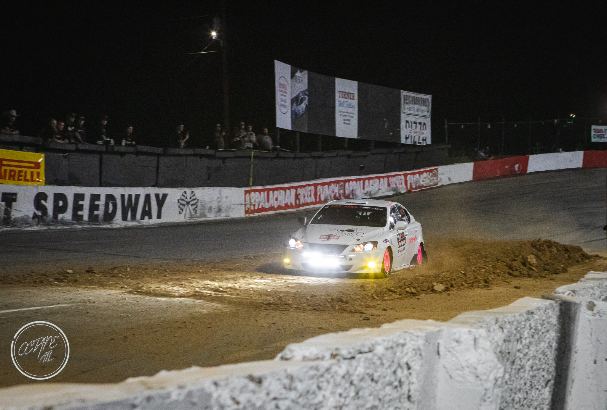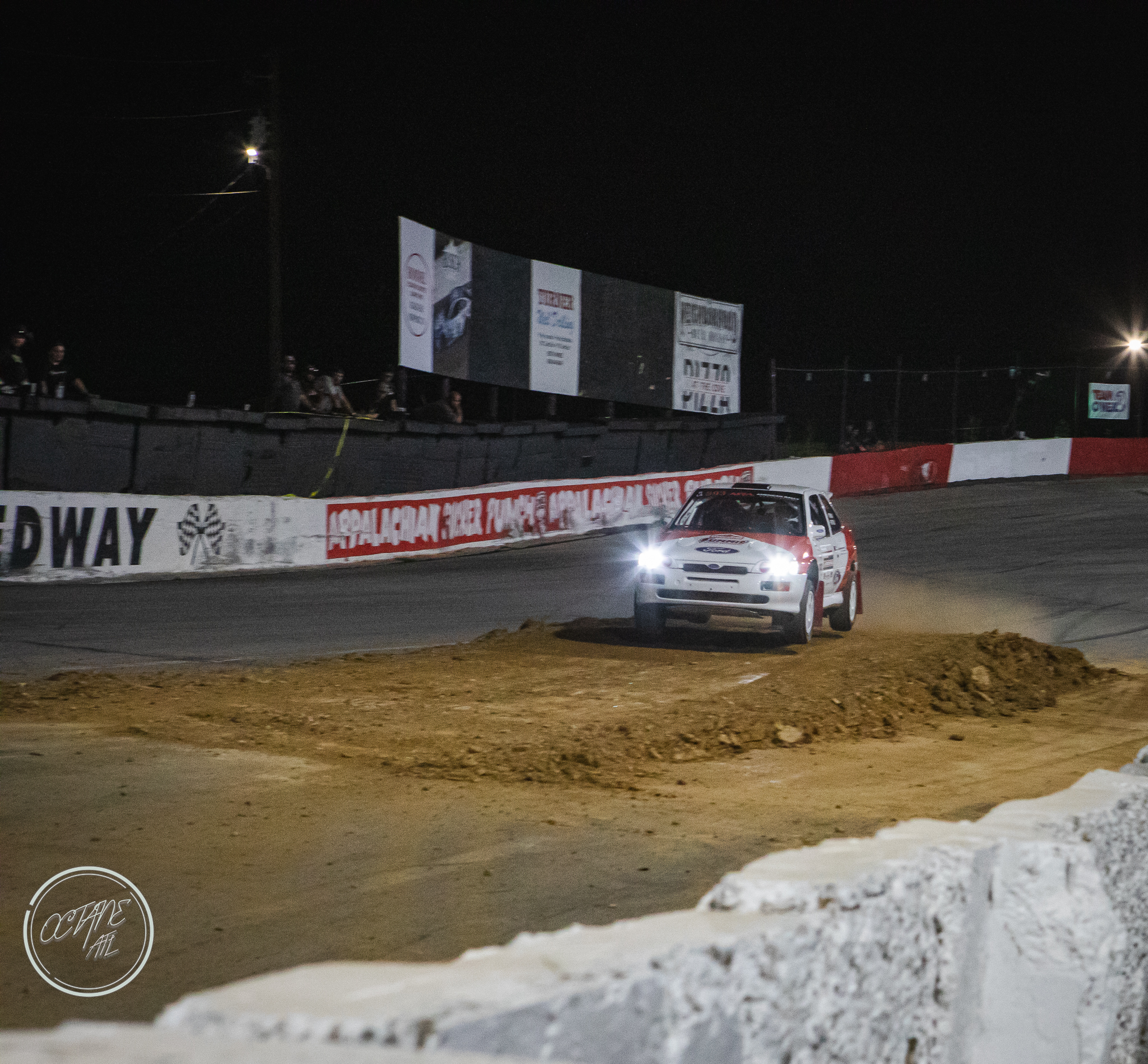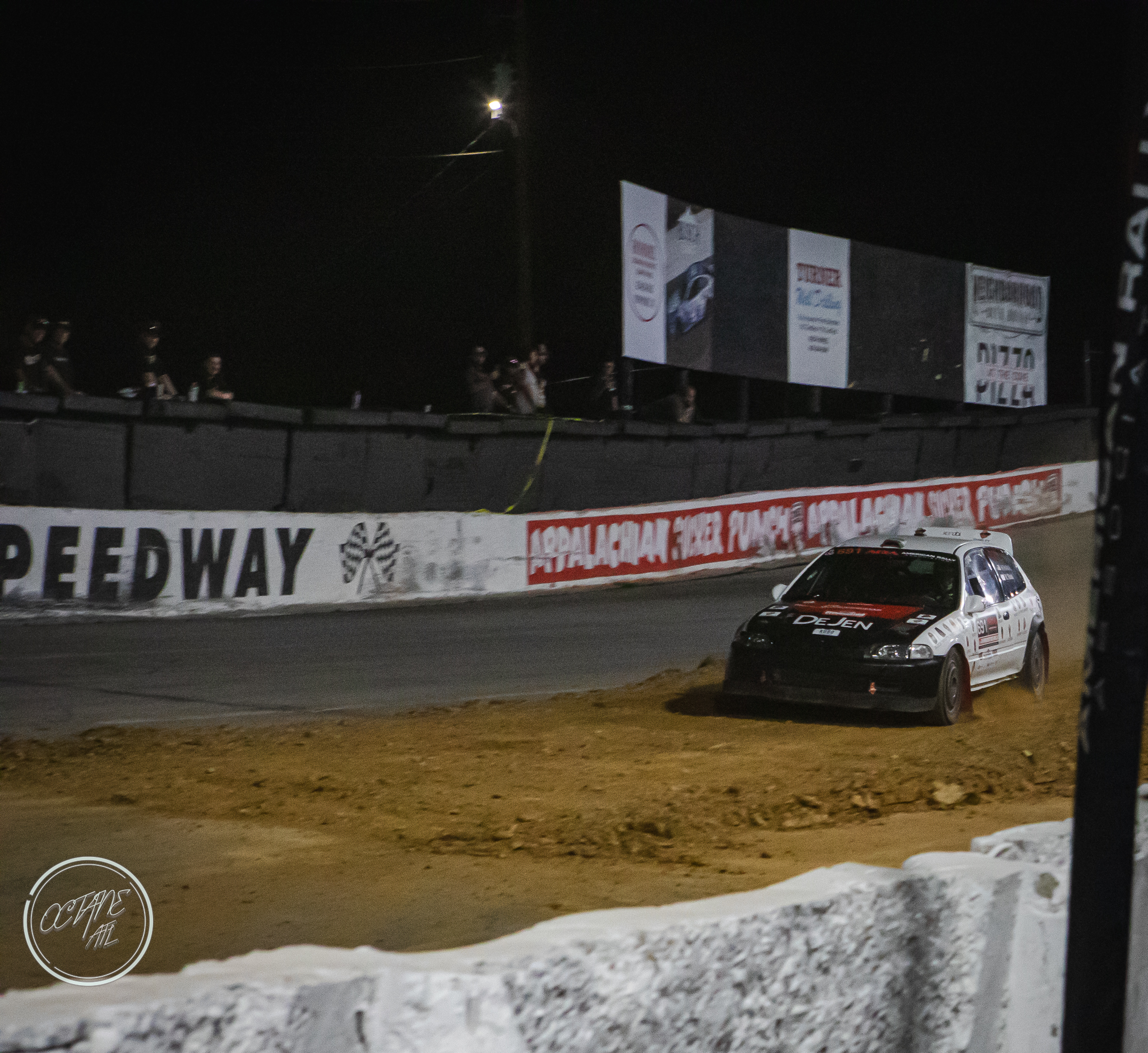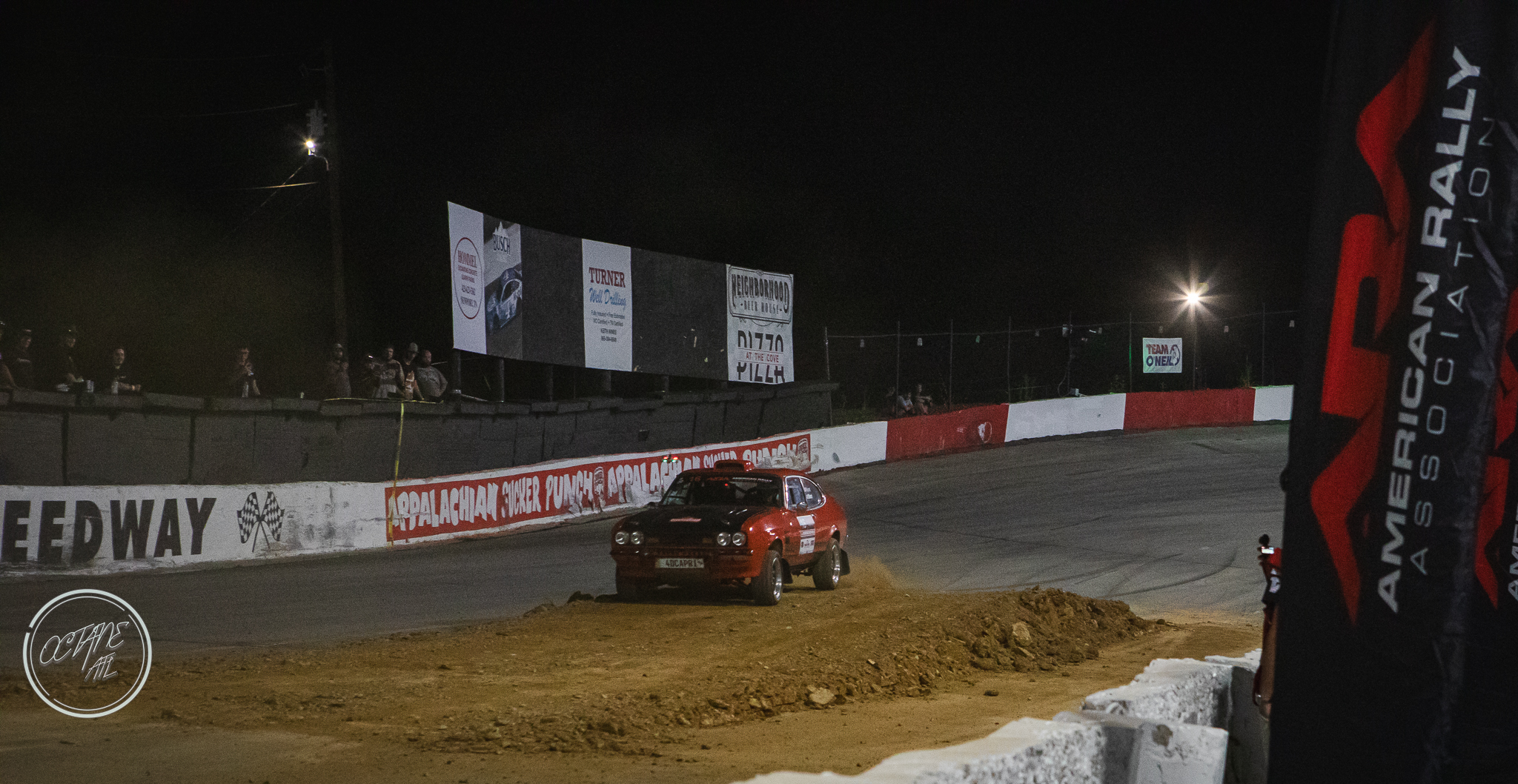 Saturday we chose a captive stage where the course shifted from gravel to pavement, which according to some of the drivers, was a bit slippery from a build up of moss. The first pass of our stage was shortened due to an off course just up the stage from us- one of the teams had missed the turn and wound up down the mountain side in the river, so we had a total of 8 cars make it through the first run. The second run there was a fuller roster, though notably more than just one car was missing. It was noted by most teams that this was one of the most technical rallies of the season, and the hills of Tennessee were proving to be harsh and challenging. By the time the third pass for our stage began the light was fading and the number of cars that passed had dwindled from a start of 50 down to a total of 36 that had made it to the last off road stage of the night. From there the teams headed back to Newport Speedway for the final event, a jump and barrels, which we missed due to helping clear our stage of spectators and cleaning up any trash as well as the tape used to mark off spectator areas.