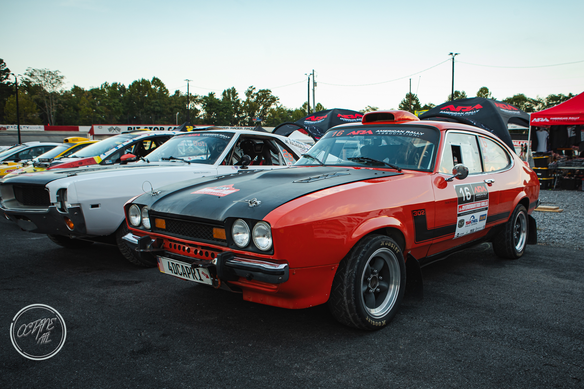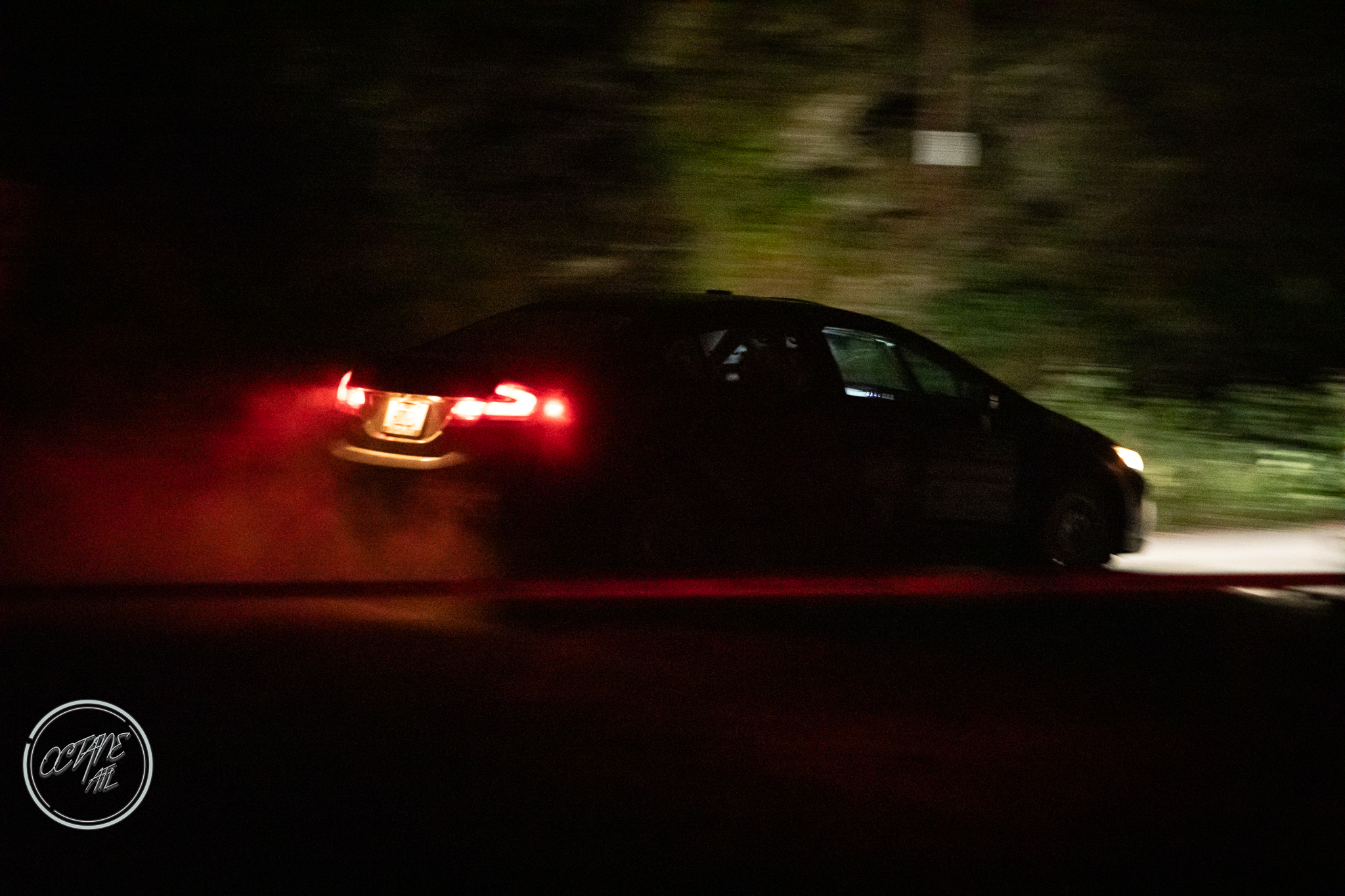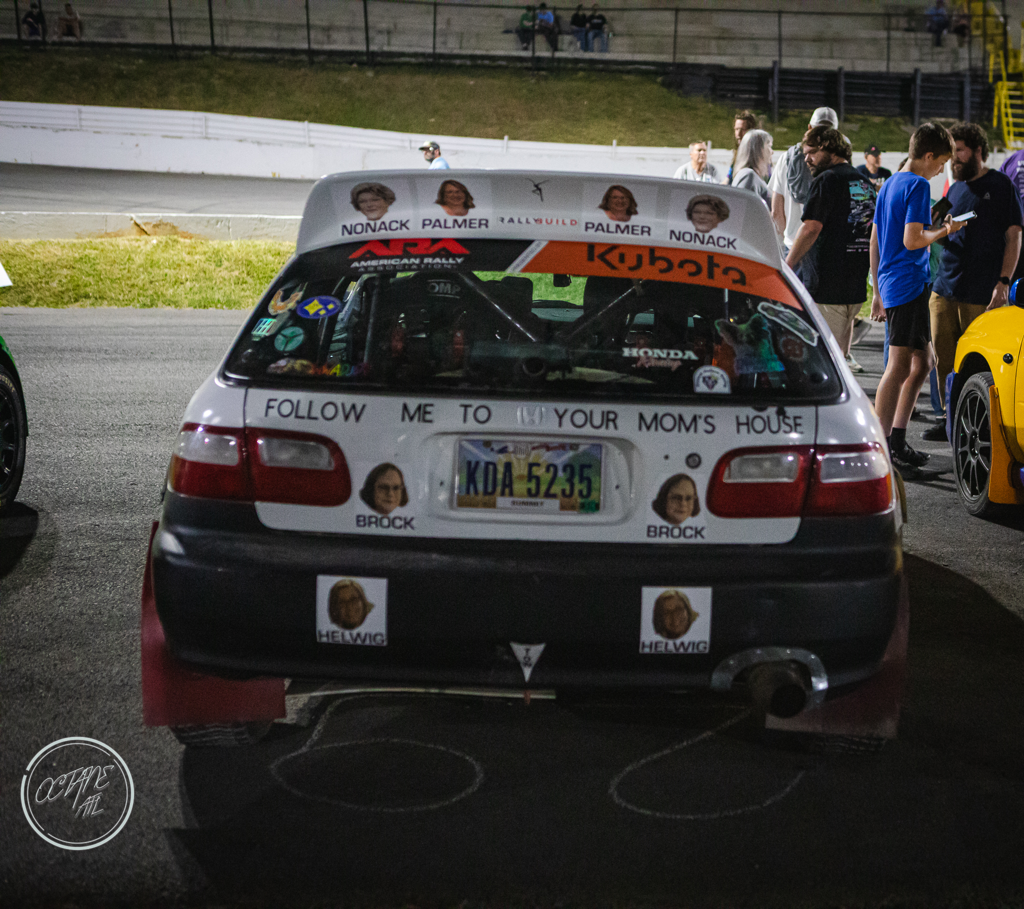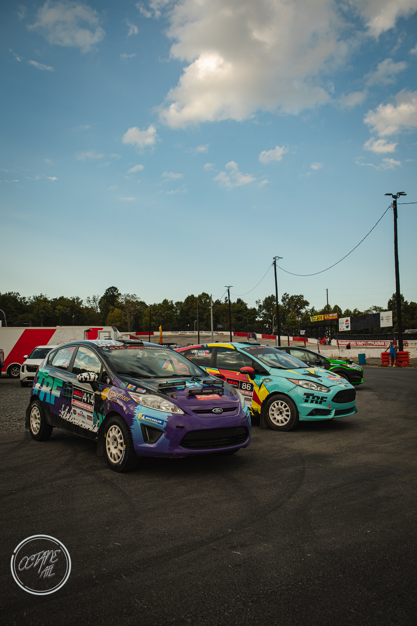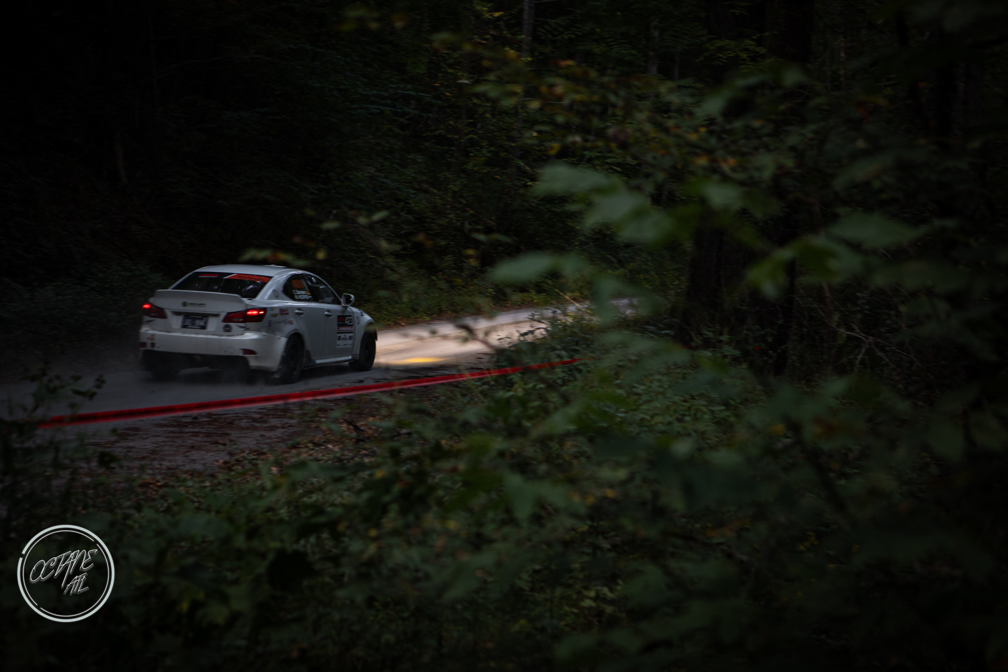 Saturday we chose a captive stage where the course shifted from gravel to pavement, which according to some of the drivers, was a bit slippery from a build up of moss. The first pass of our stage was shortened due to an off course just up the stage from us- one of the teams had missed the turn and wound up down the mountain side in the river, so we had a total of 8 cars make it through the first run. The second run there was a fuller roster, though notably more than just one car was missing. It was noted by most teams that this was one of the most technical rallies of the season, and the hills of Tennessee were proving to be harsh and challenging. By the time the third pass for our stage began the light was fading and the number of cars that passed had dwindled from a start of 50 down to a total of 36 that had made it to the last off road stage of the night. From there the teams headed back to Newport Speedway for the final event, a jump and barrels, which we missed due to helping clear our stage of spectators and cleaning up any trash as well as the tape used to mark off spectator areas.