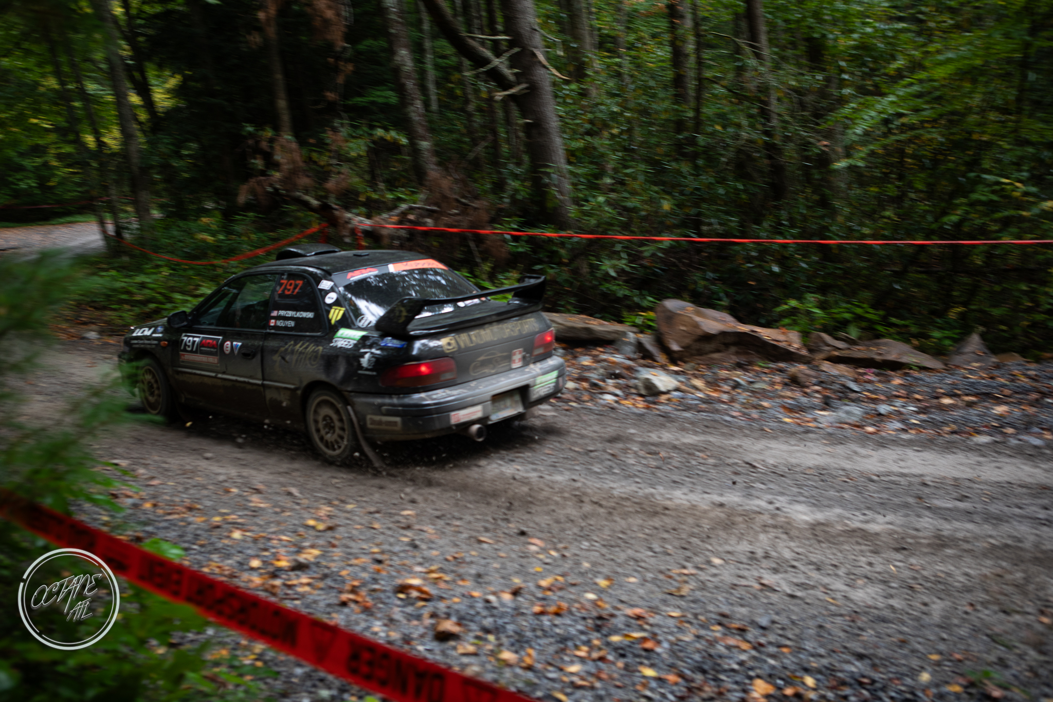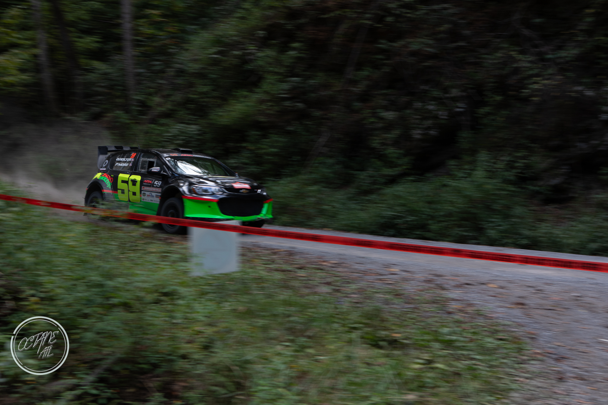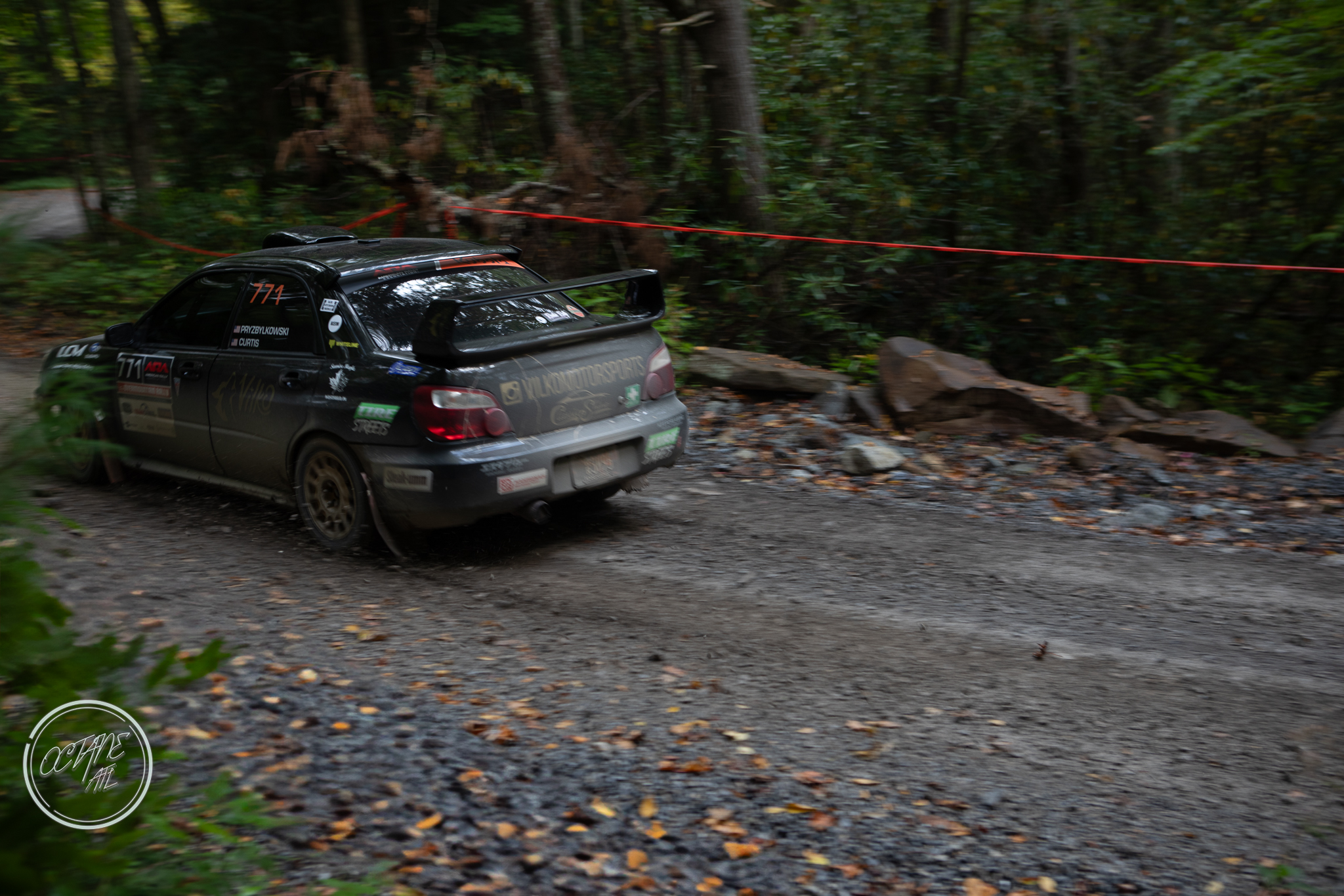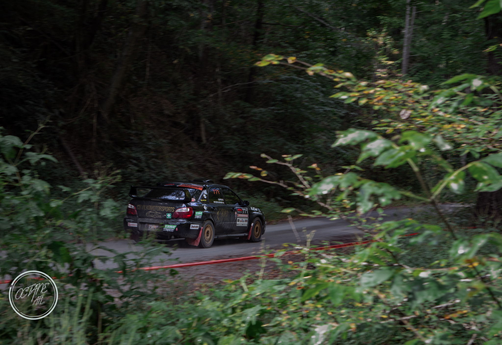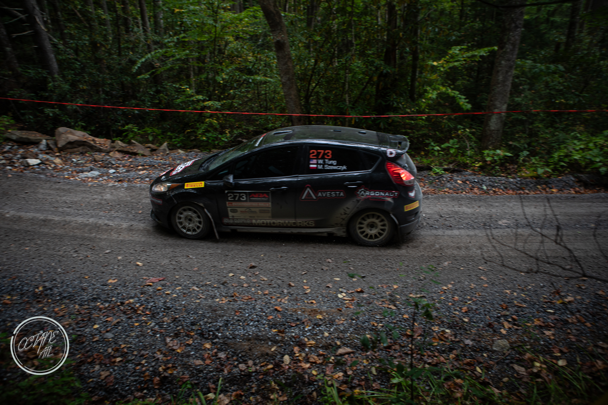 My spot Sunday was a bit easier to get great shots from, and the captain of the spectator zone had made a specific area just for media for which I was grateful, even if my shins toted home some new bruises from gravel being kicked up by a few competitors. The Sunday viewing spaces were also captive, but we were at a campground within the forest which had camp toilets, which was a nicety I was grateful for. There were only 2 passes at our location scheduled and the end of the first had 3 cars which were escorted out at travel pace due to an unhappy local at the finish who wanted to pass through despite the road being closed. The stages saw some carnage and, much like Saturday, the number of cars dwindled between passes of our stage. During the service break it began to rain in patches along the stages; some, like our area, seeing a little more than a drizzle while others saw full out downpours causing rapidly changing conditions to battle not just for competitors but also for the media crews as well. It was obvious how much muddier other stages were by the conditions of the cars as they passed by, some looking like they had attempted to drive through endless mud puddles and all coated in gravel dust and dirt as they dried out. Due to work schedules and a lengthy drive home, we didn’t stay to capture the podiums and end of the rally festivities, but I certainly know for next time to make time for this.