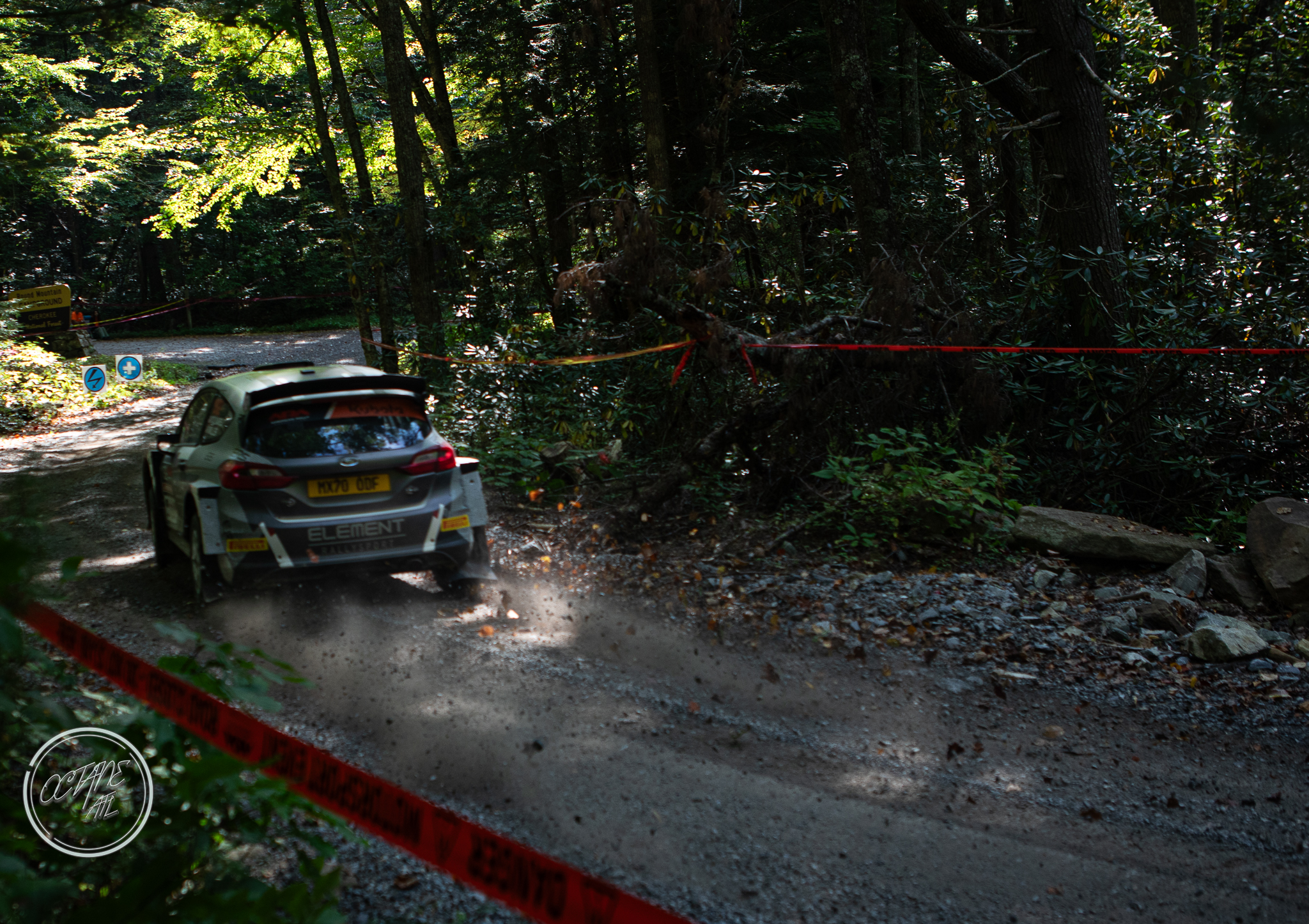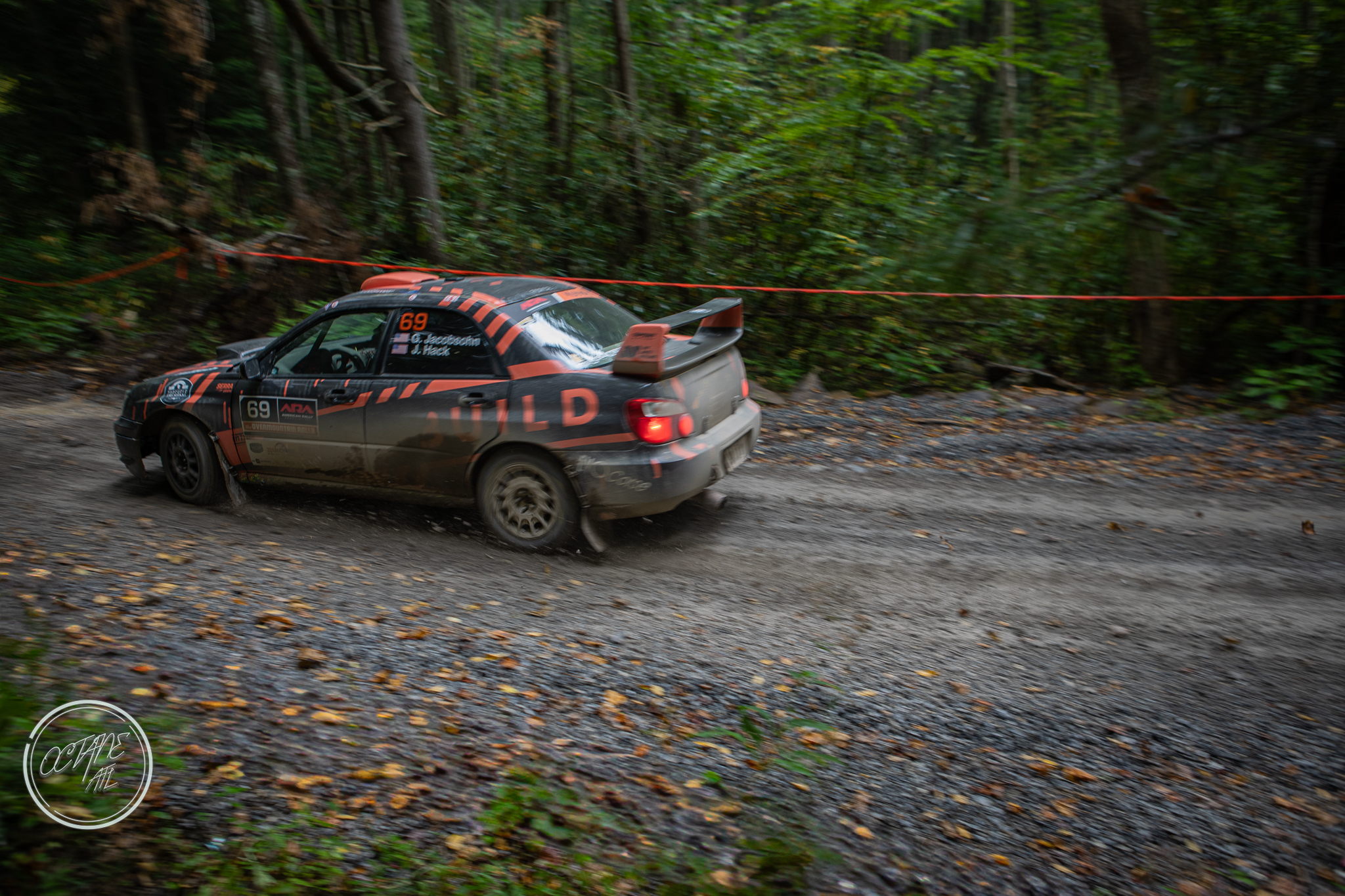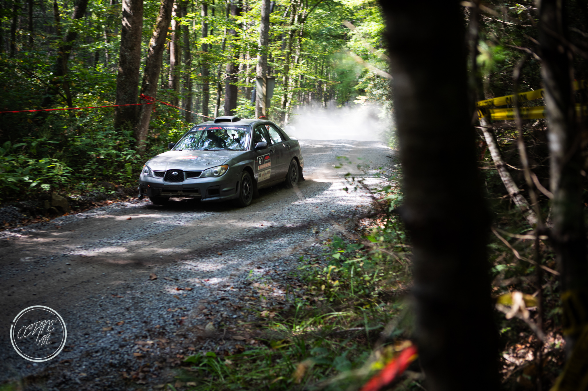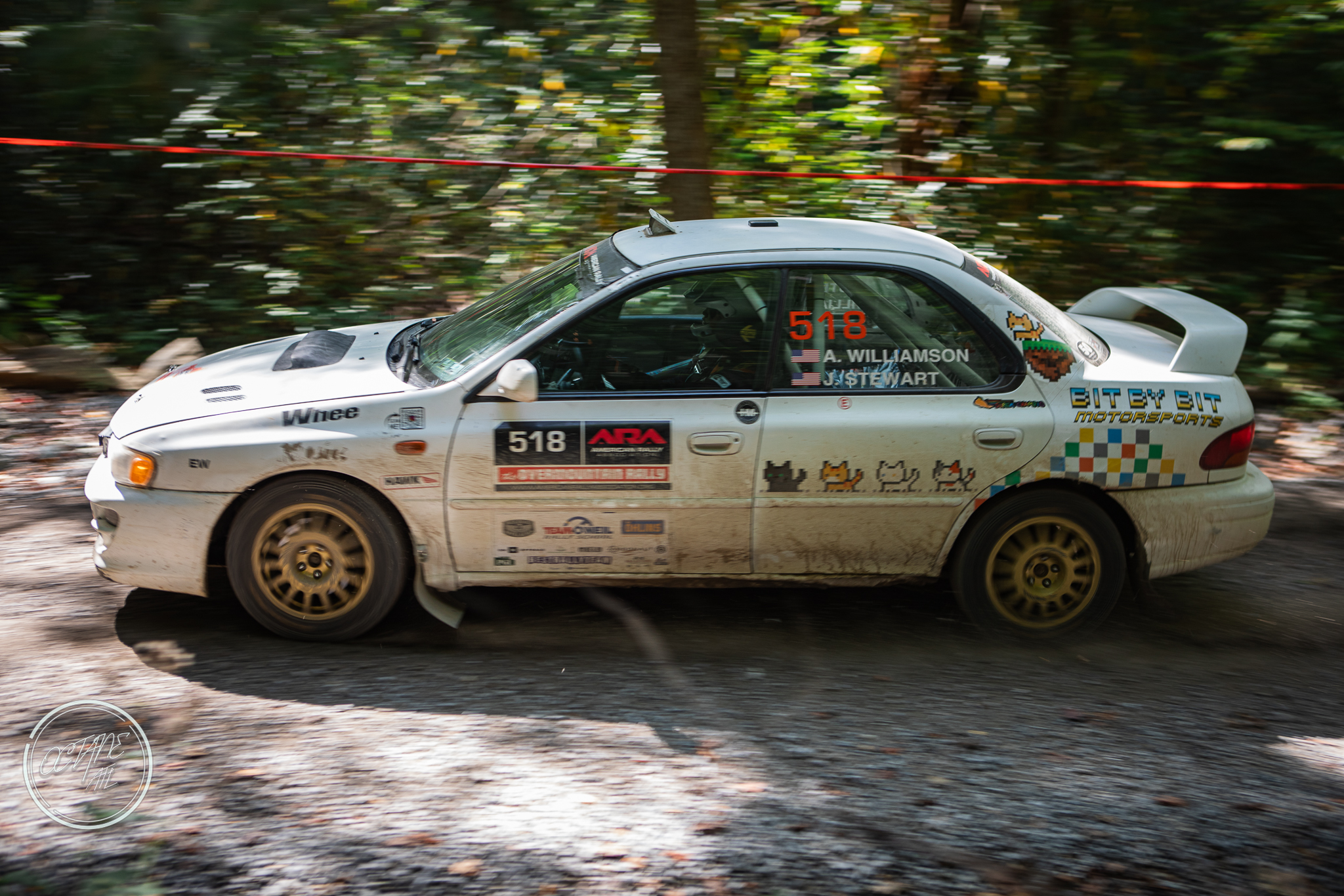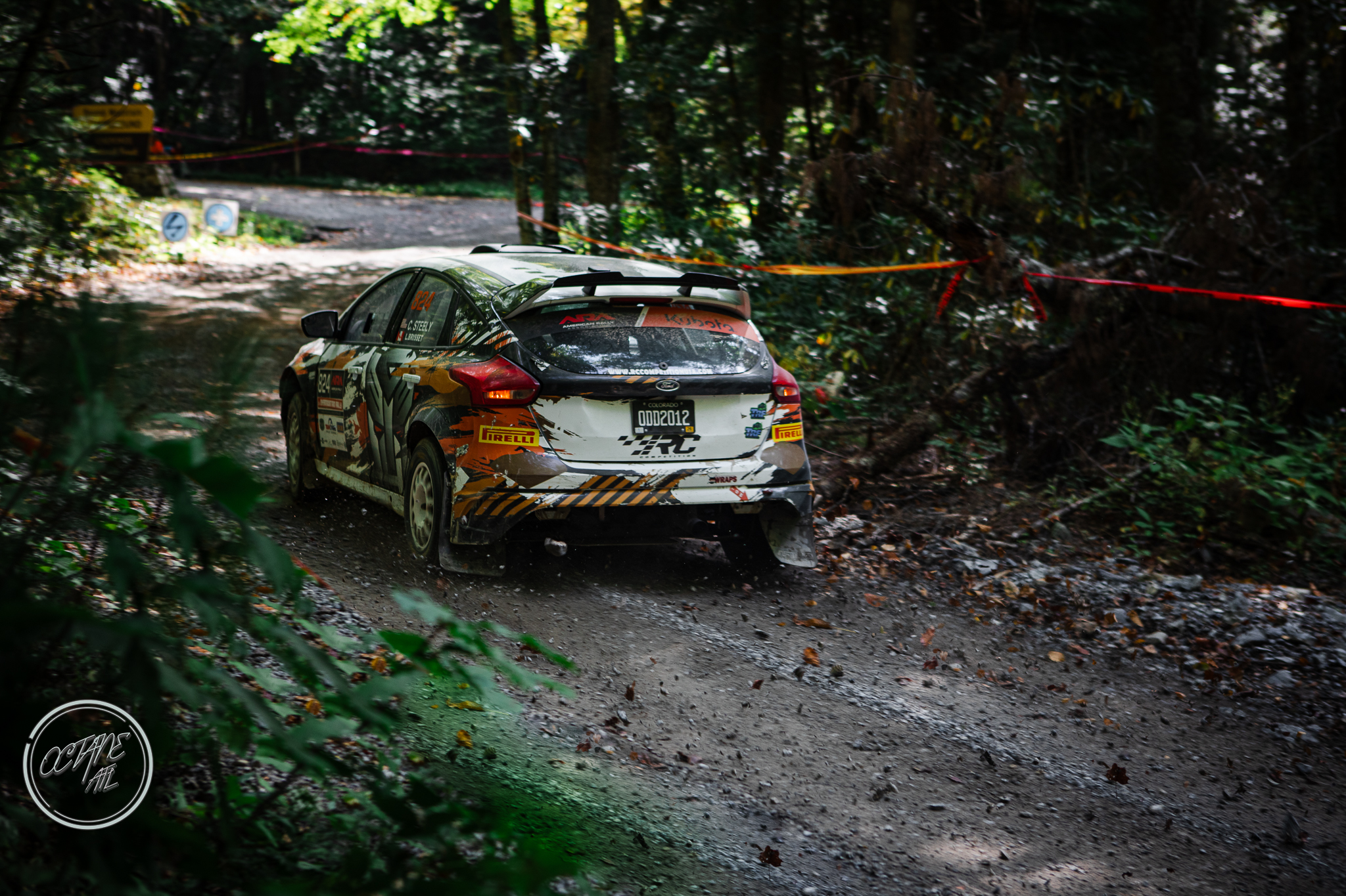 My spot Sunday was a bit easier to get great shots from, and the captain of the spectator zone had made a specific area just for media for which I was grateful, even if my shins toted home some new bruises from gravel being kicked up by a few competitors. The Sunday viewing spaces were also captive, but we were at a campground within the forest which had camp toilets, which was a nicety I was grateful for. There were only 2 passes at our location scheduled and the end of the first had 3 cars which were escorted out at travel pace due to an unhappy local at the finish who wanted to pass through despite the road being closed. The stages saw some carnage and, much like Saturday, the number of cars dwindled between passes of our stage. During the service break it began to rain in patches along the stages; some, like our area, seeing a little more than a drizzle while others saw full out downpours causing rapidly changing conditions to battle not just for competitors but also for the media crews as well. It was obvious how much muddier other stages were by the conditions of the cars as they passed by, some looking like they had attempted to drive through endless mud puddles and all coated in gravel dust and dirt as they dried out. Due to work schedules and a lengthy drive home, we didn’t stay to capture the podiums and end of the rally festivities, but I certainly know for next time to make time for this.