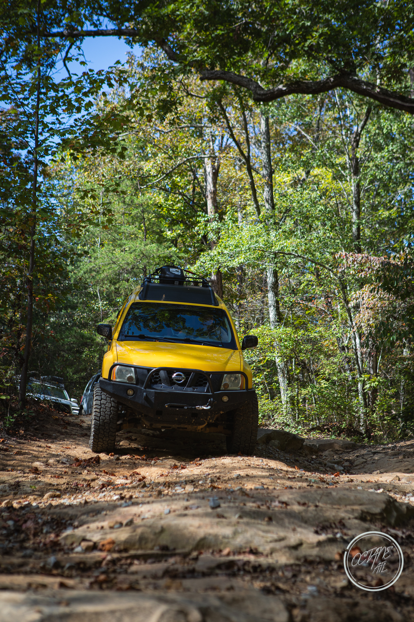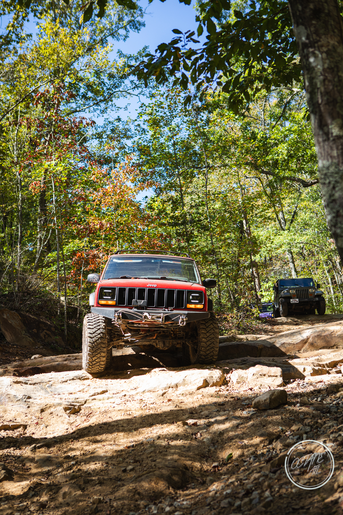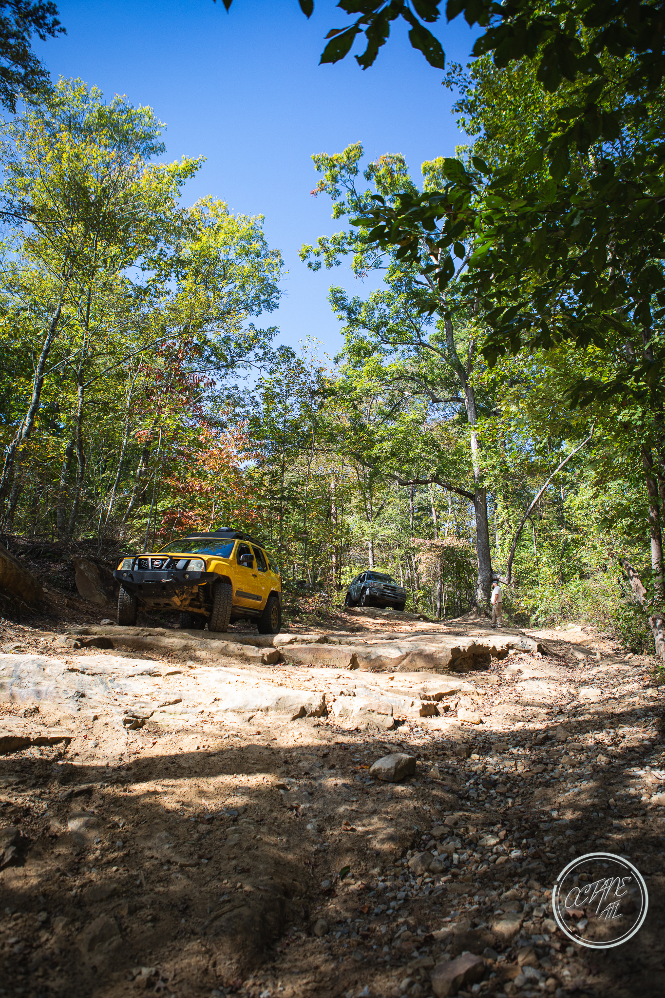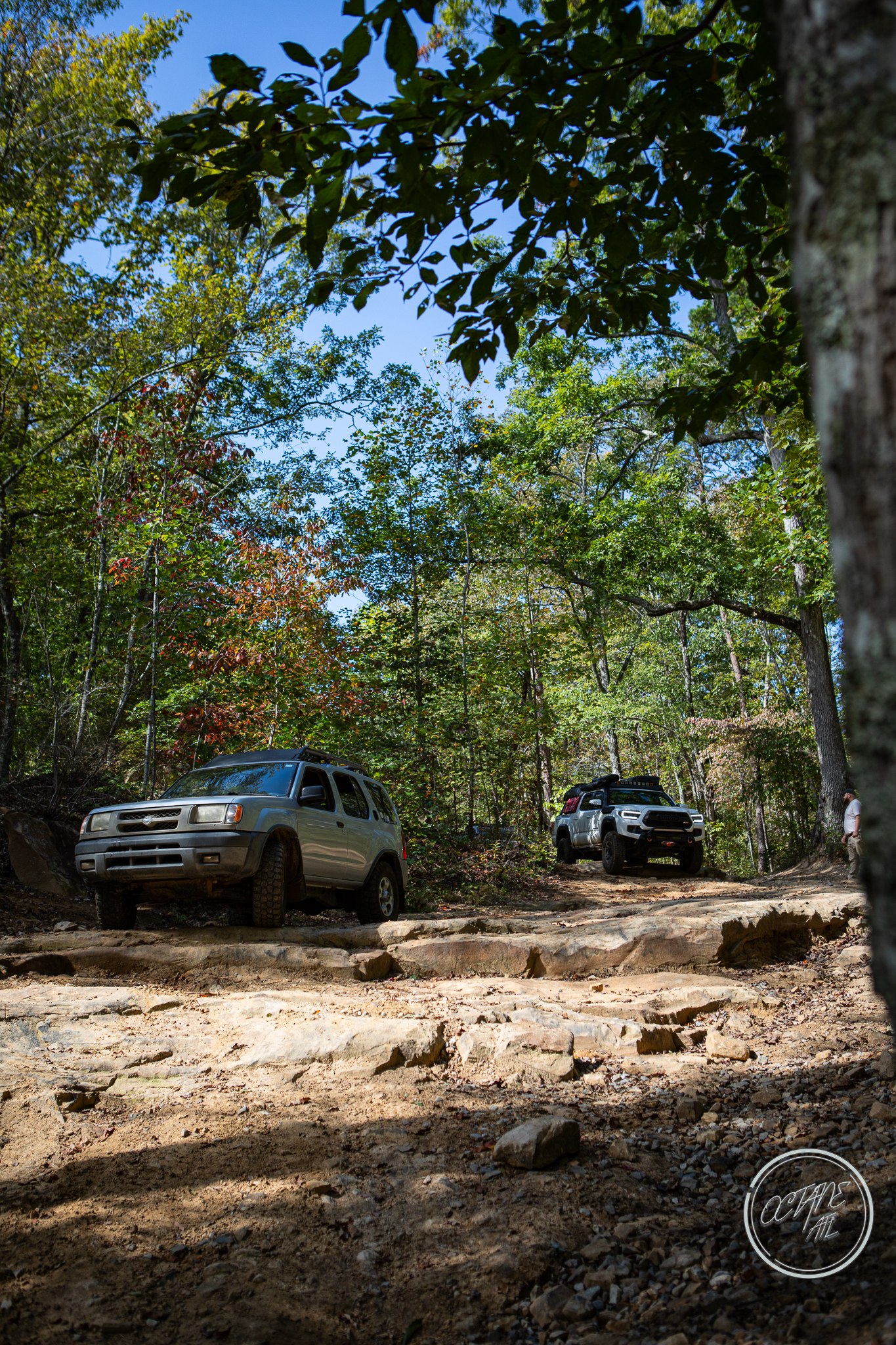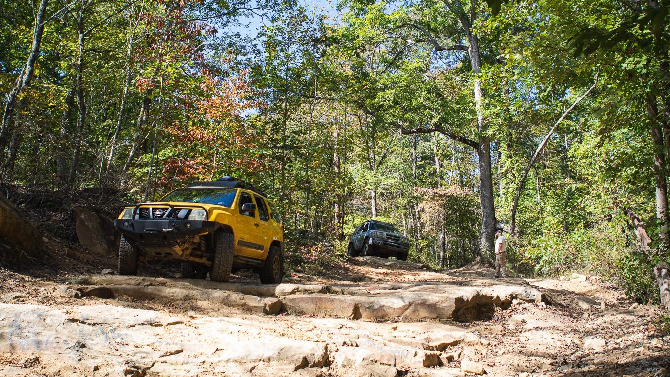 From here we worked our way to the second off-road portion which had quite a few water features, mainly stinky puddles, for us all to create some mud in, as well as a downed tree that, if you’re lifted a good bit, could be problematic but for most of us it was just choosing the correct line. This portion is well worth it, as there’s a stunning overlook to take in the rolling foothills that make up the Chattanooga area beneath Signal Mountain. This overlook also makes for some fun photo opportunities if you’re willing to park your rig near the edge. We lingered here for a bit in the warm early fall sun and spent time chatting while folks took their turn on the edge for the photos.