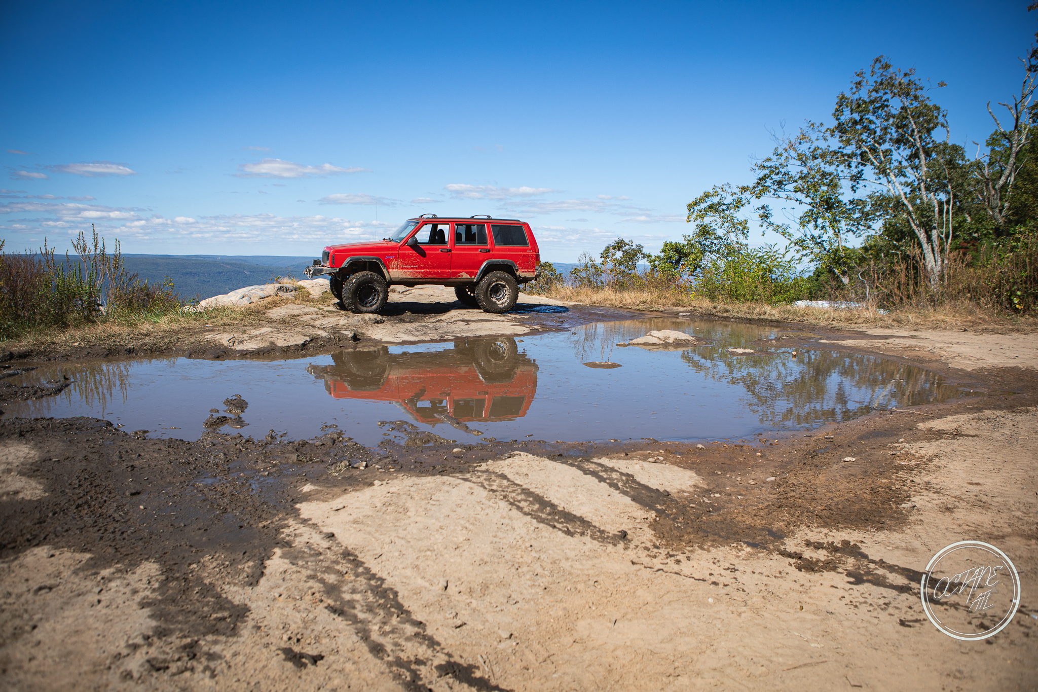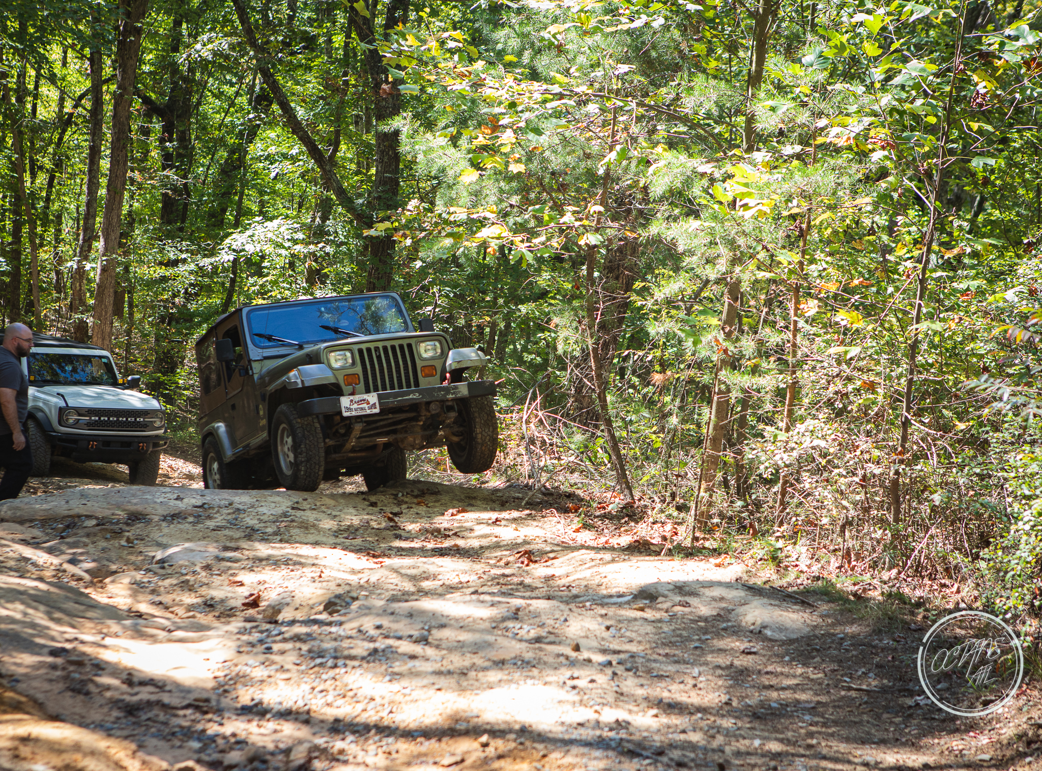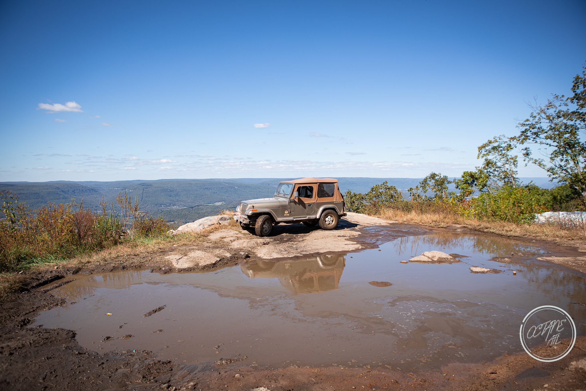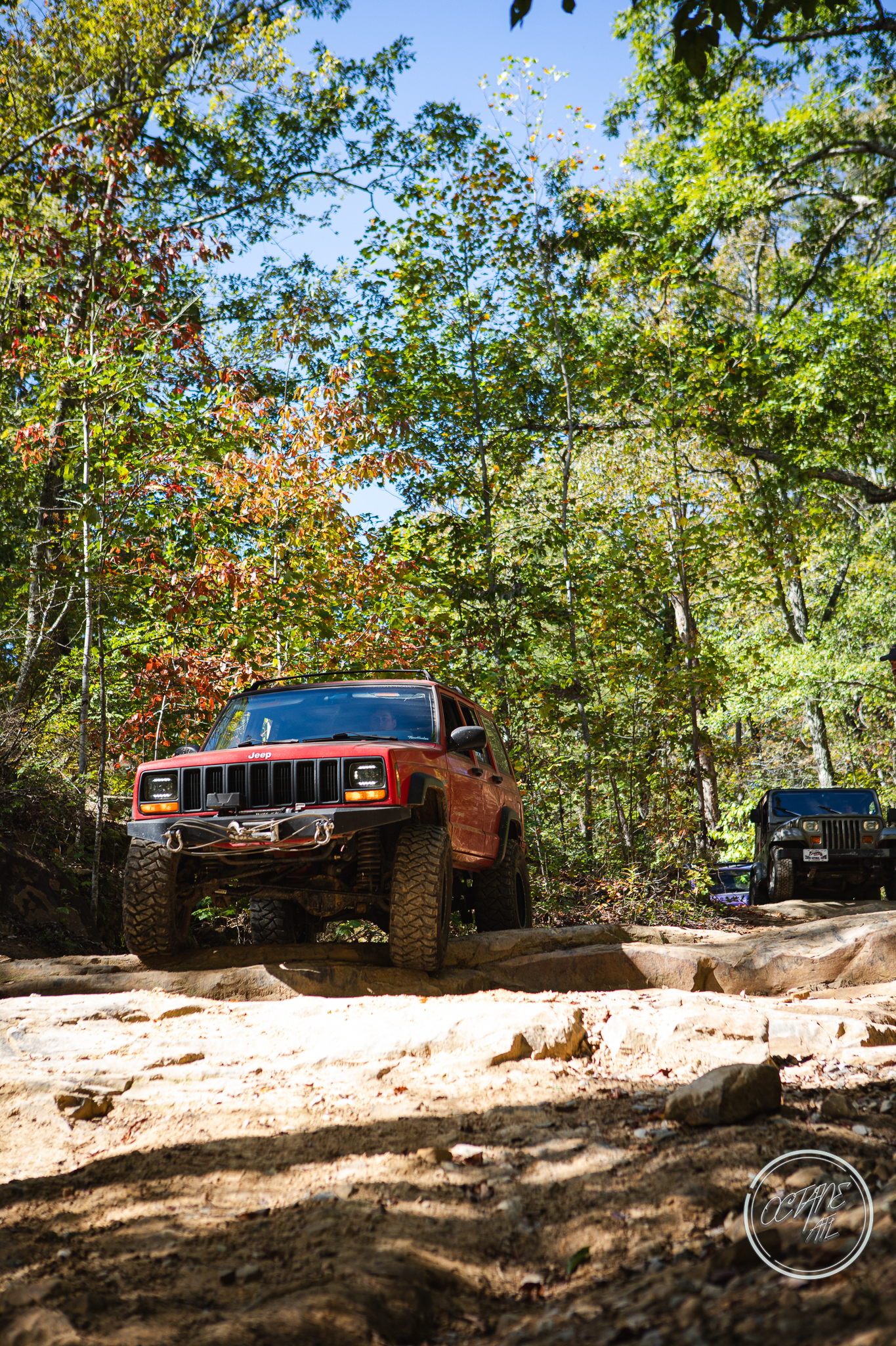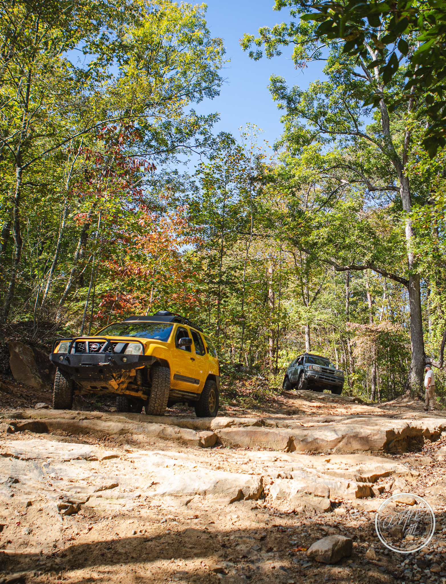 From here we worked our way to the second off-road portion which had quite a few water features, mainly stinky puddles, for us all to create some mud in, as well as a downed tree that, if you’re lifted a good bit, could be problematic but for most of us it was just choosing the correct line. This portion is well worth it, as there’s a stunning overlook to take in the rolling foothills that make up the Chattanooga area beneath Signal Mountain. This overlook also makes for some fun photo opportunities if you’re willing to park your rig near the edge. We lingered here for a bit in the warm early fall sun and spent time chatting while folks took their turn on the edge for the photos.