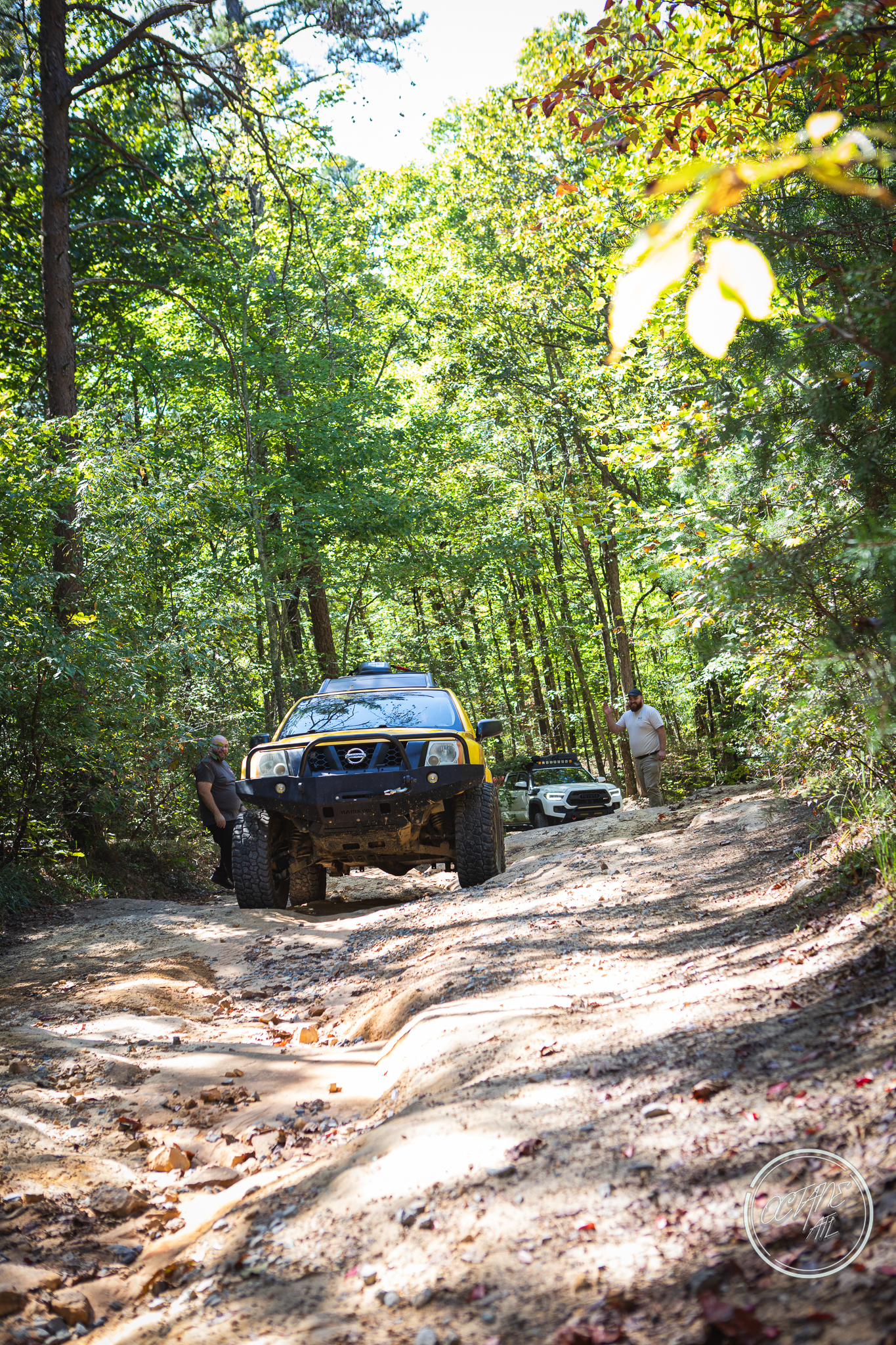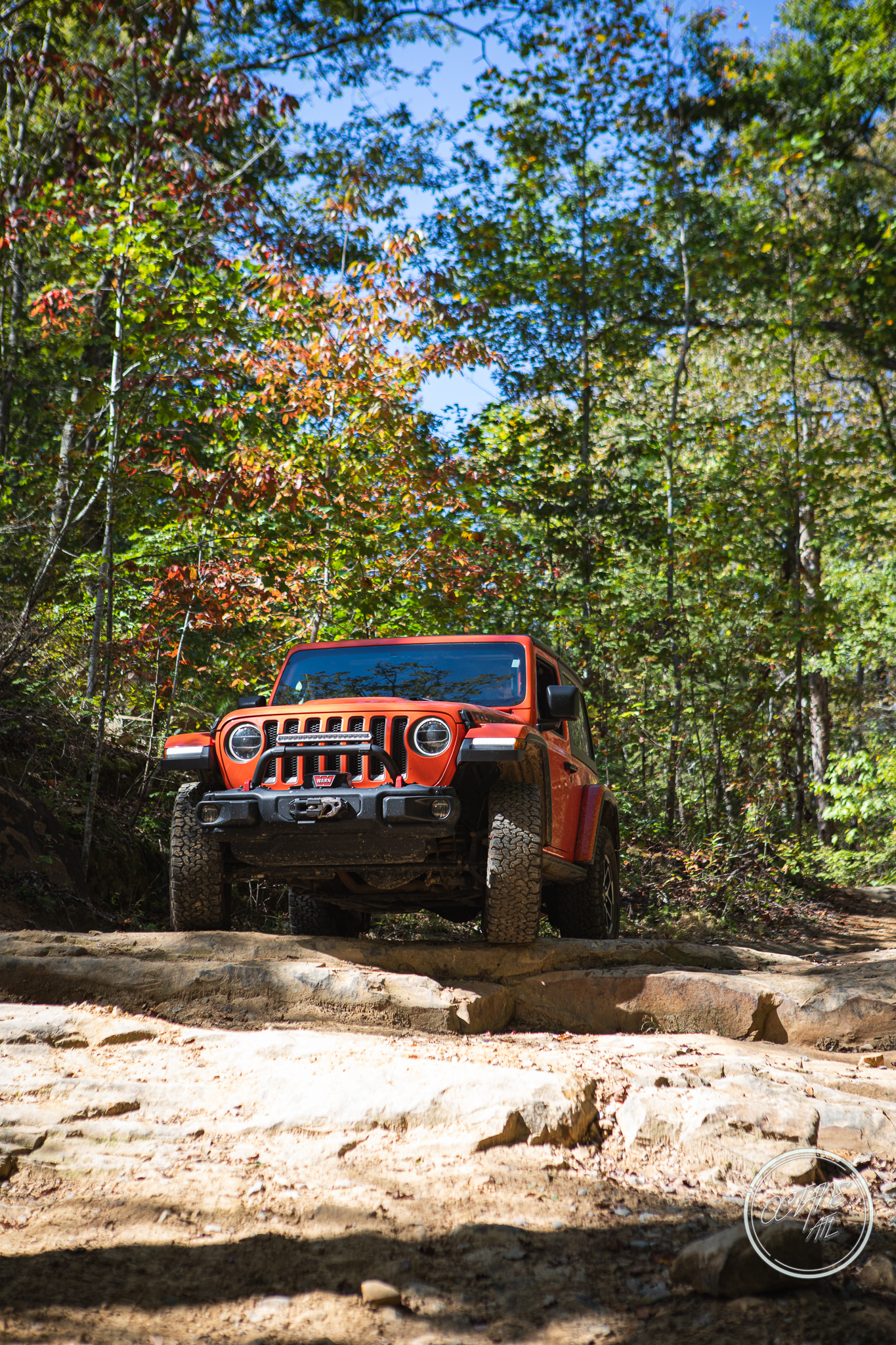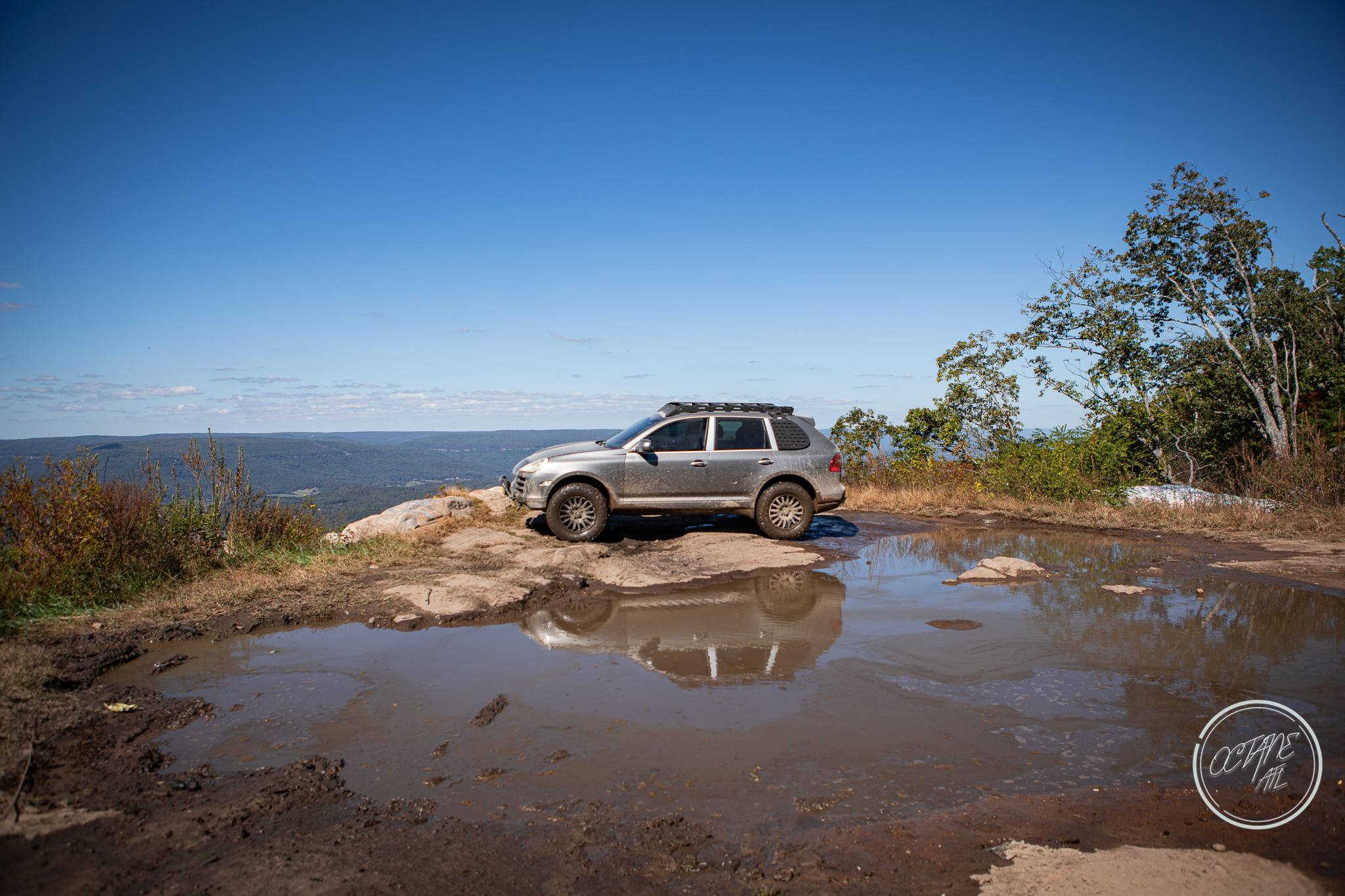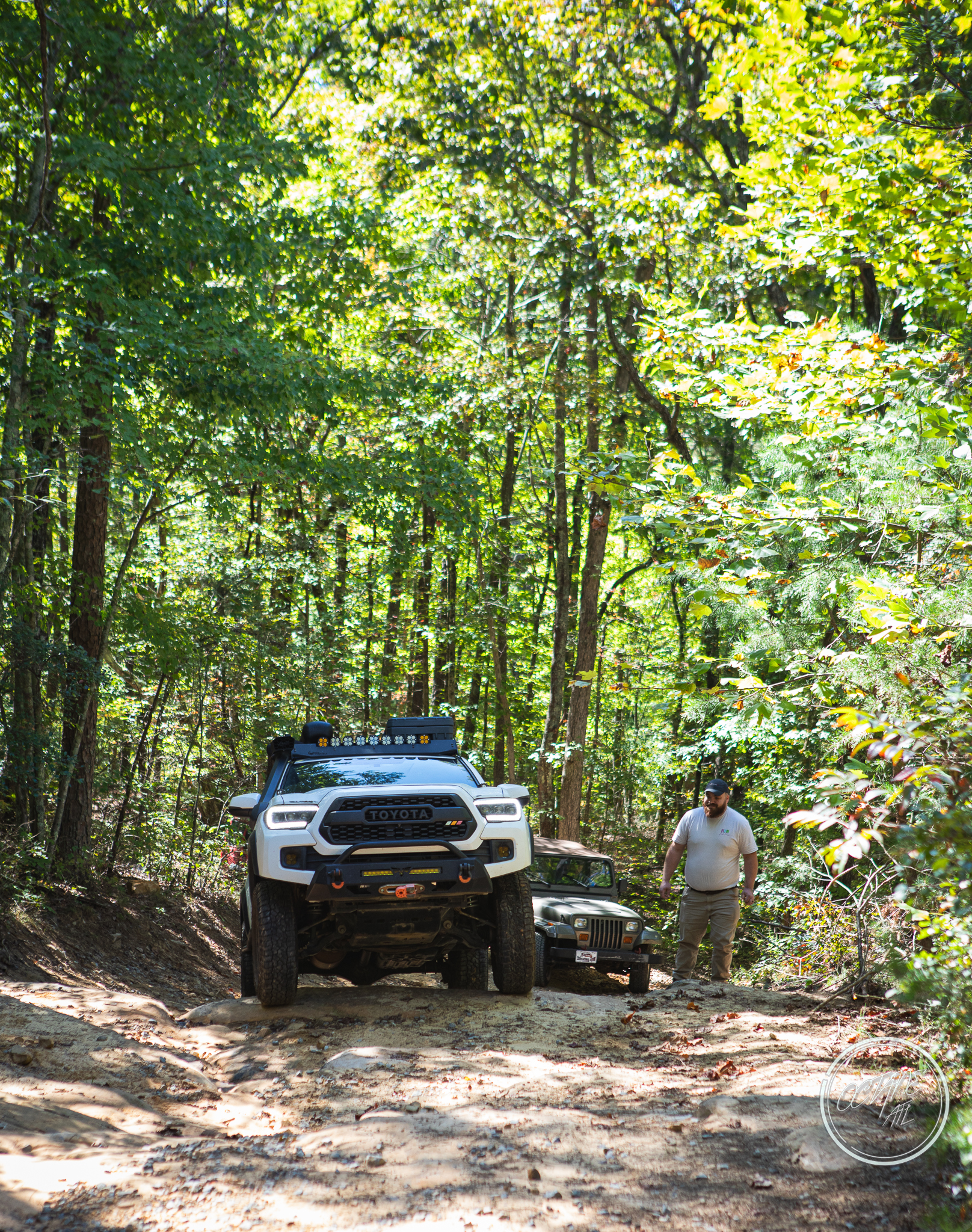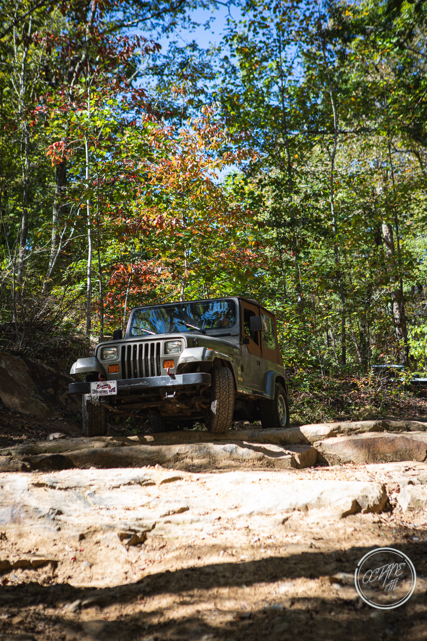 From here we worked our way to the second off-road portion which had quite a few water features, mainly stinky puddles, for us all to create some mud in, as well as a downed tree that, if you’re lifted a good bit, could be problematic but for most of us it was just choosing the correct line. This portion is well worth it, as there’s a stunning overlook to take in the rolling foothills that make up the Chattanooga area beneath Signal Mountain. This overlook also makes for some fun photo opportunities if you’re willing to park your rig near the edge. We lingered here for a bit in the warm early fall sun and spent time chatting while folks took their turn on the edge for the photos.