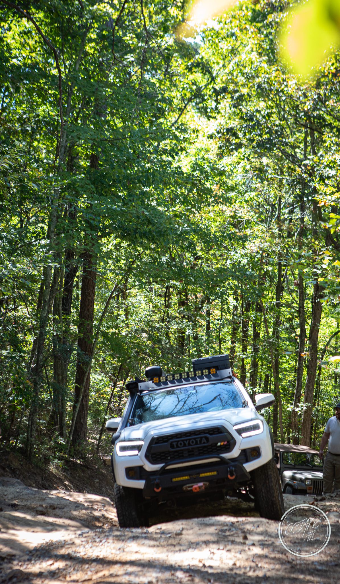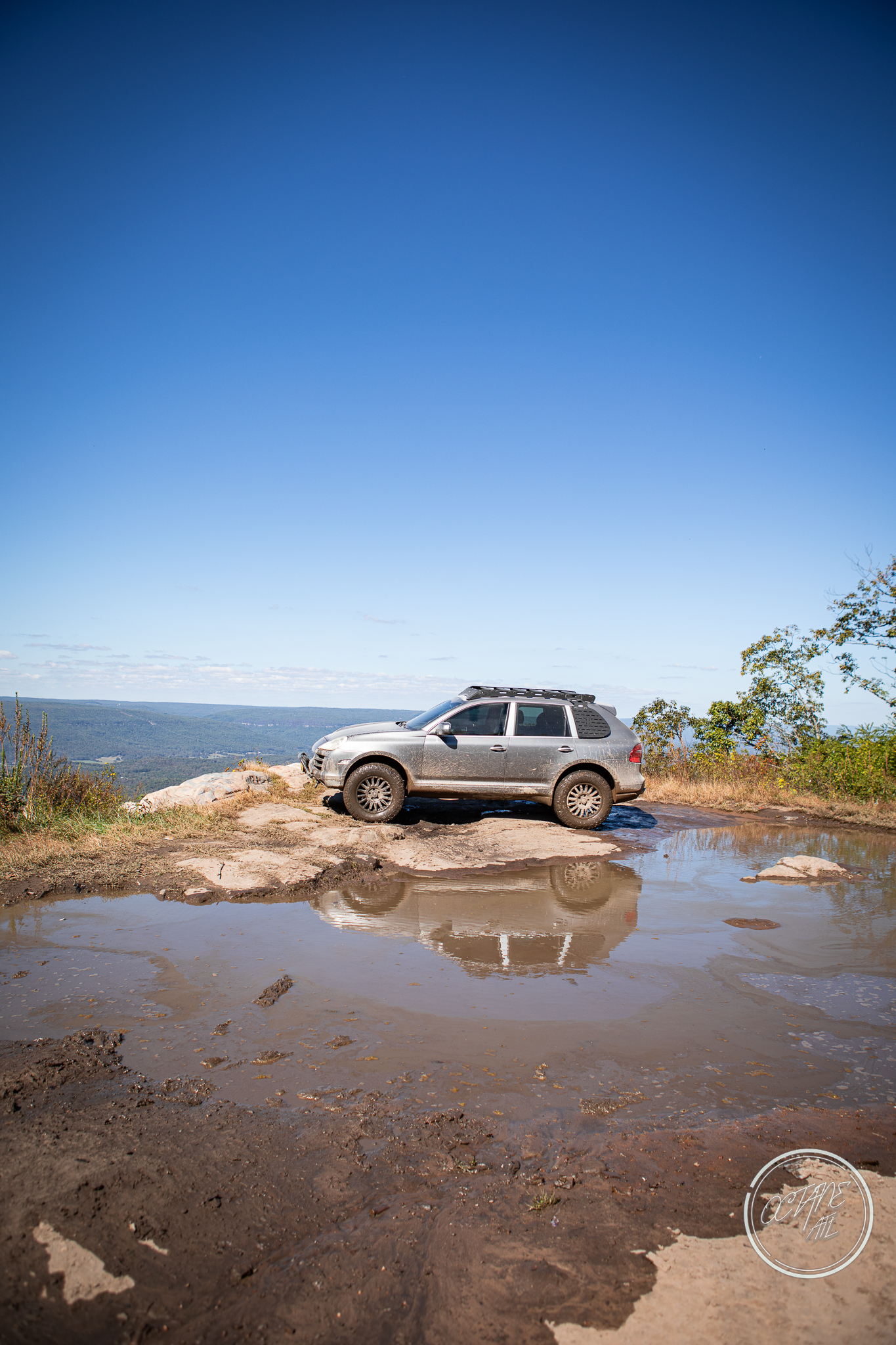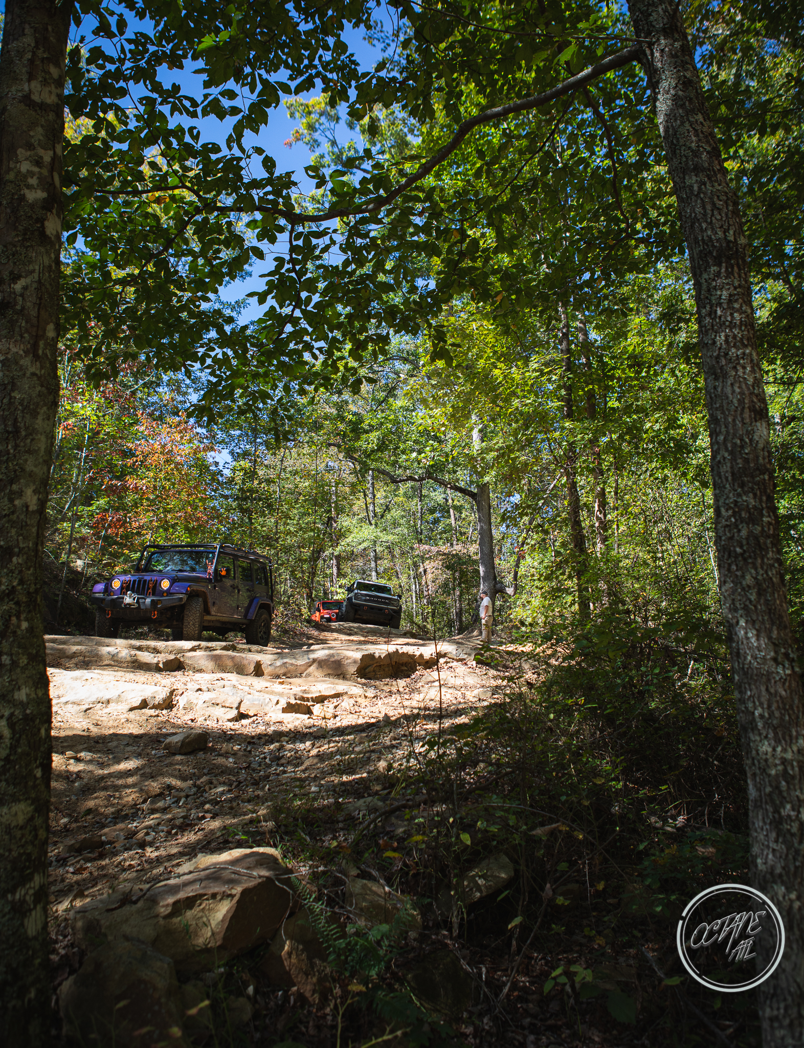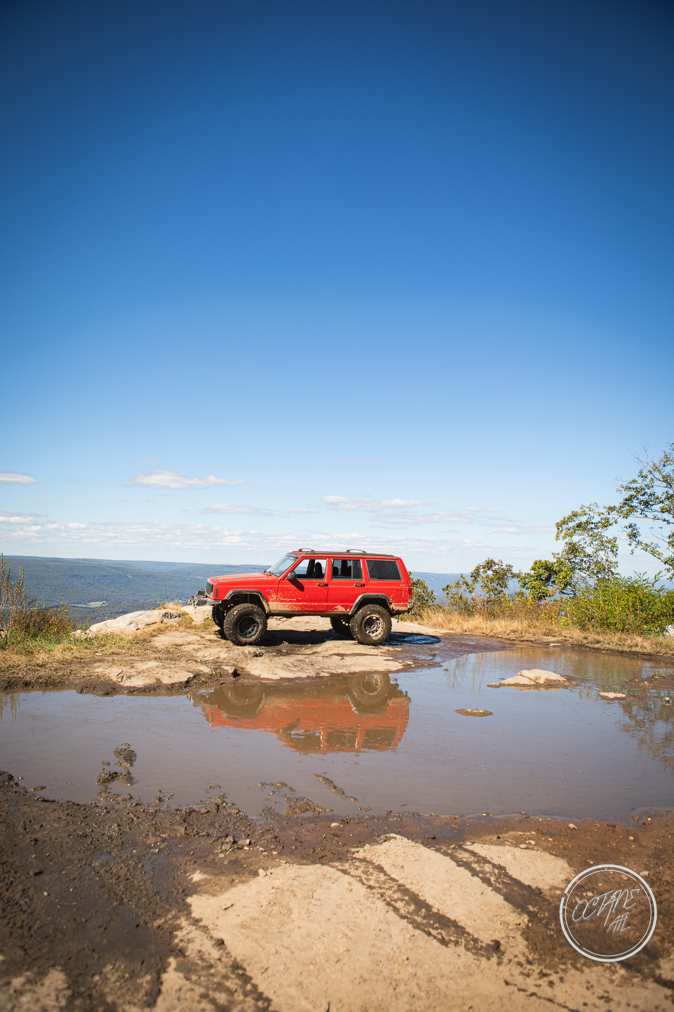 From here we worked our way to the second off-road portion which had quite a few water features, mainly stinky puddles, for us all to create some mud in, as well as a downed tree that, if you’re lifted a good bit, could be problematic but for most of us it was just choosing the correct line. This portion is well worth it, as there’s a stunning overlook to take in the rolling foothills that make up the Chattanooga area beneath Signal Mountain. This overlook also makes for some fun photo opportunities if you’re willing to park your rig near the edge. We lingered here for a bit in the warm early fall sun and spent time chatting while folks took their turn on the edge for the photos.
