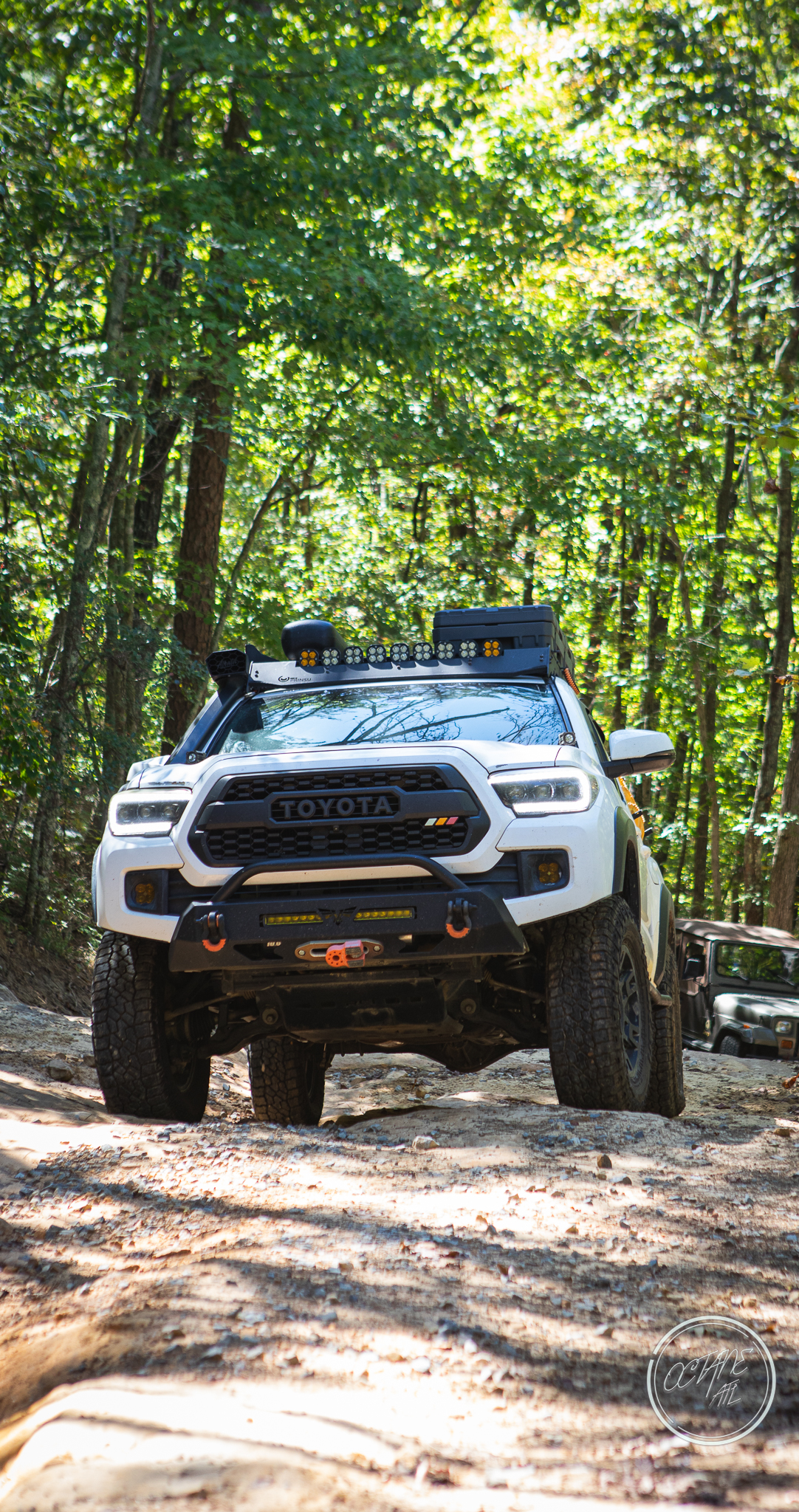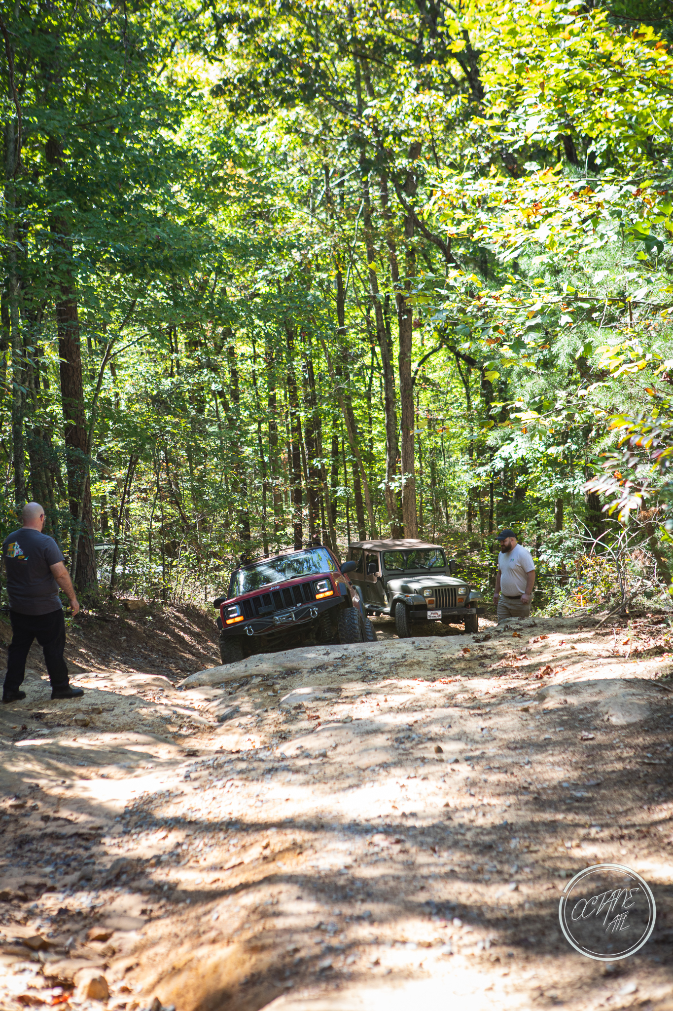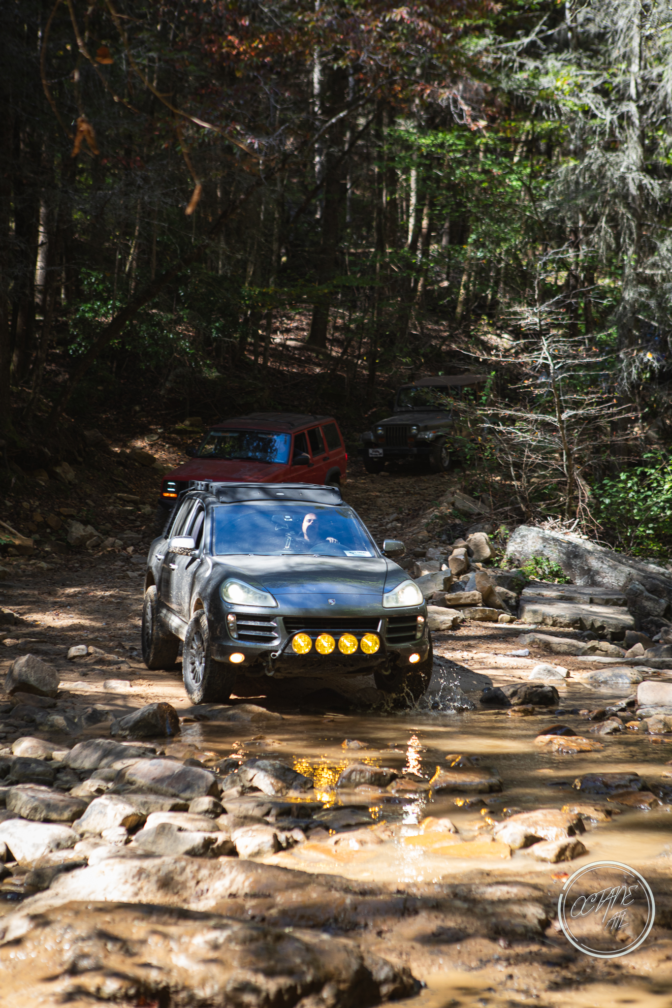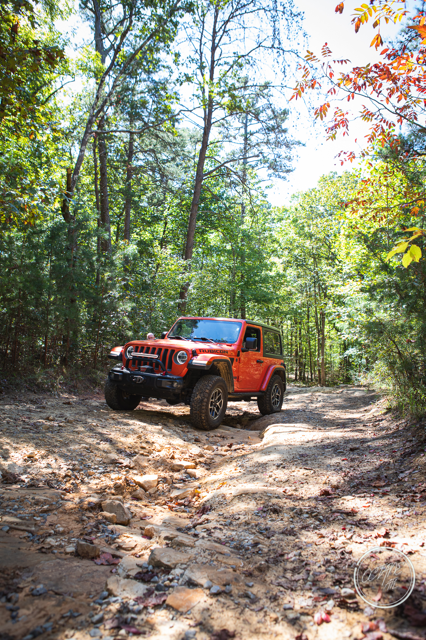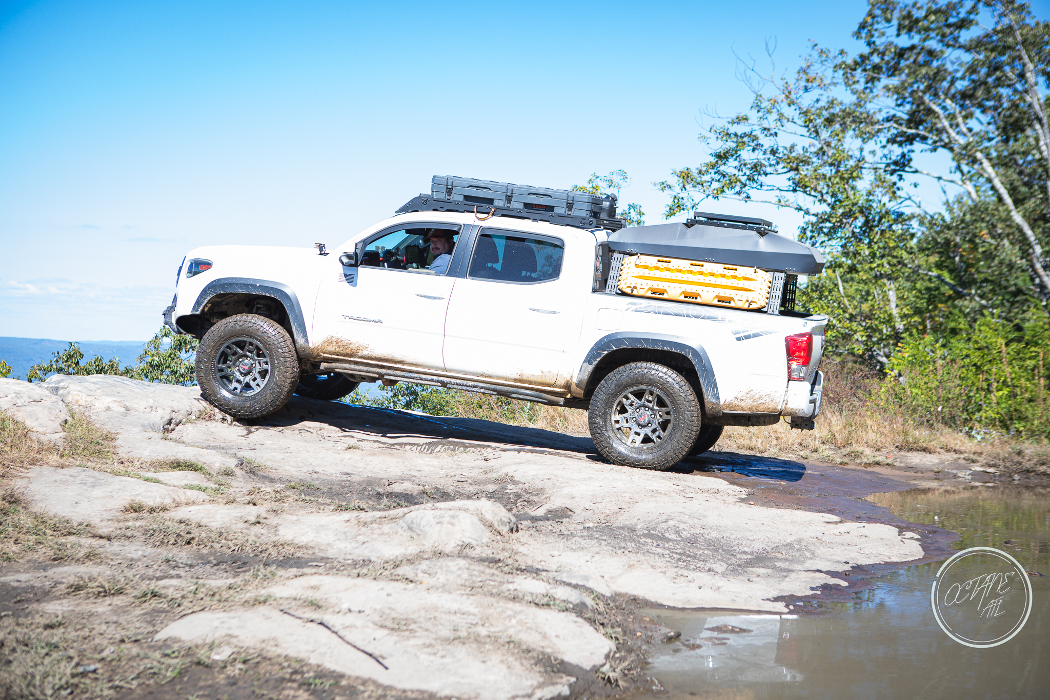 From here we worked our way to the second off-road portion which had quite a few water features, mainly stinky puddles, for us all to create some mud in, as well as a downed tree that, if you’re lifted a good bit, could be problematic but for most of us it was just choosing the correct line. This portion is well worth it, as there’s a stunning overlook to take in the rolling foothills that make up the Chattanooga area beneath Signal Mountain. This overlook also makes for some fun photo opportunities if you’re willing to park your rig near the edge. We lingered here for a bit in the warm early fall sun and spent time chatting while folks took their turn on the edge for the photos.
